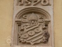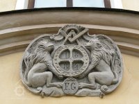na fasádě dvě reliéfní desky s letopčtem 1570, jedna s erbem meče a iniciálami JC, druhá s erbem se třemi růžemi v šikmém břevně