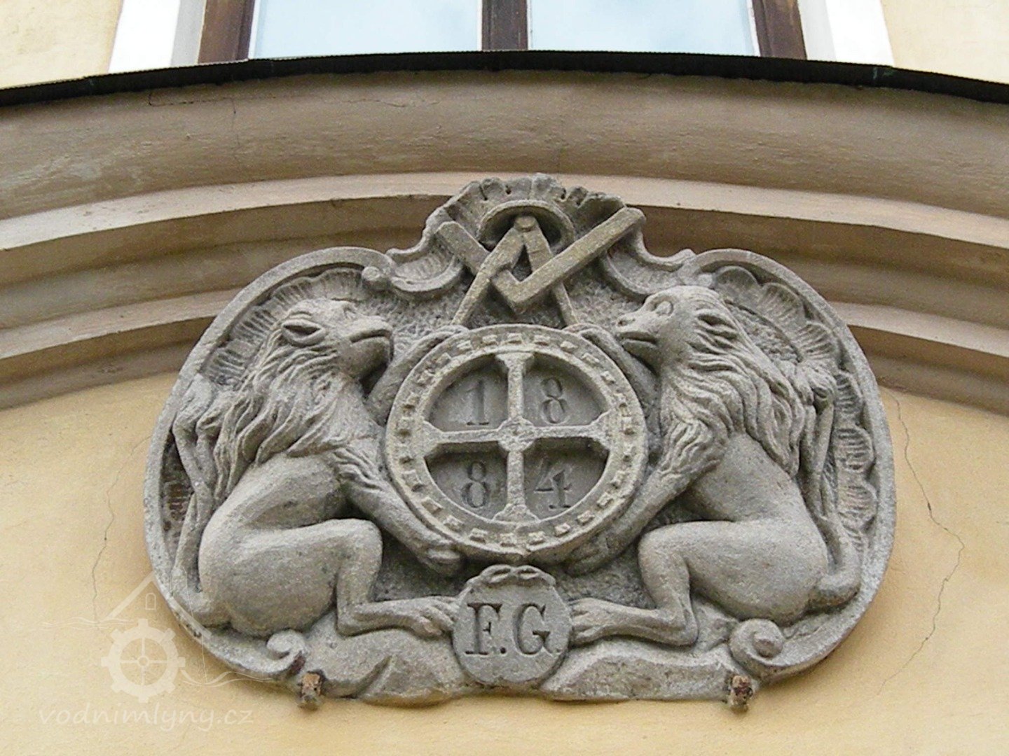 ozdobný empírový portál s mlynářským znakem a iniciálami EG