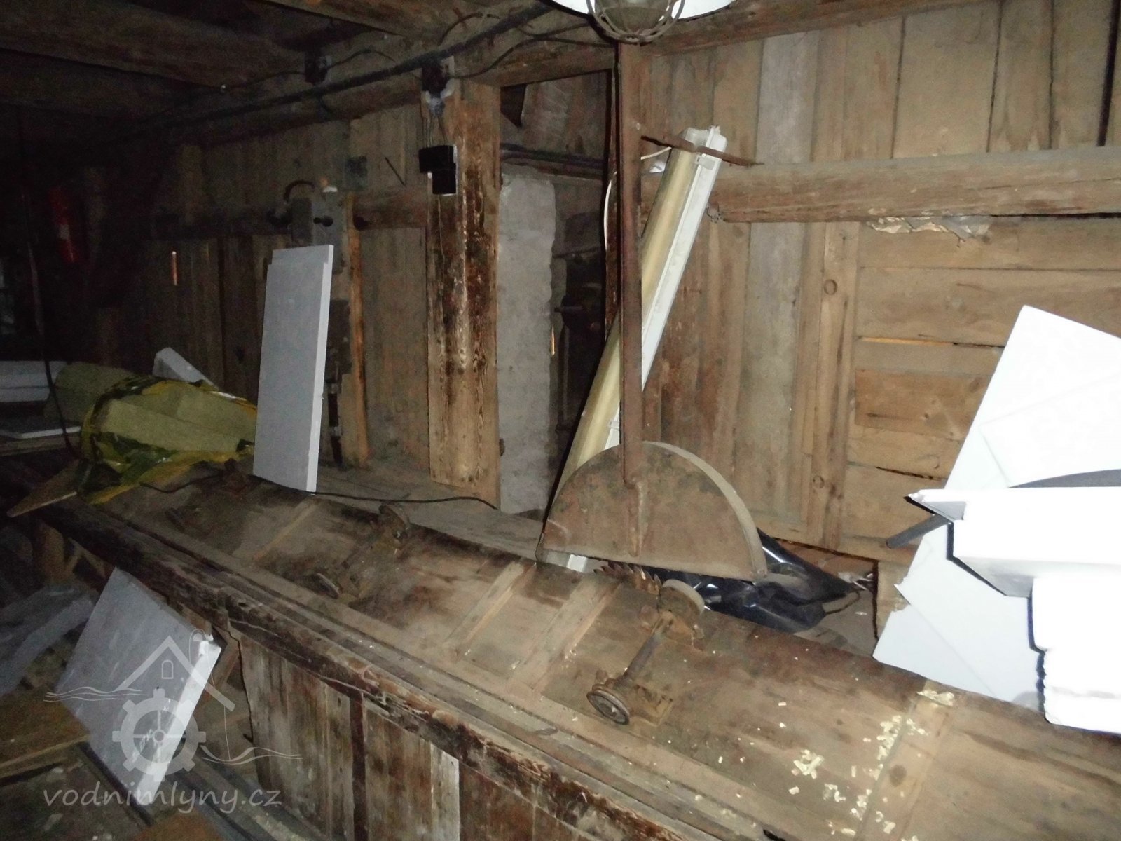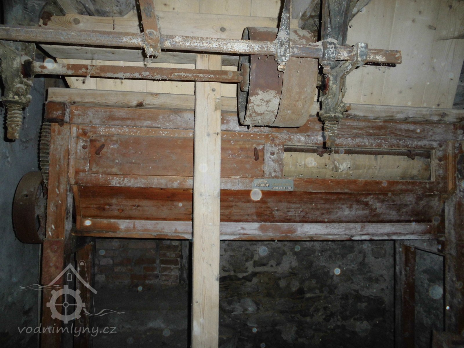 hlavní transmise, v pozadí zazděný prostup pro řemen k turbíně, 2013, © Veselý, (Prvky na obrázku: transmise, řemenice, převody)
