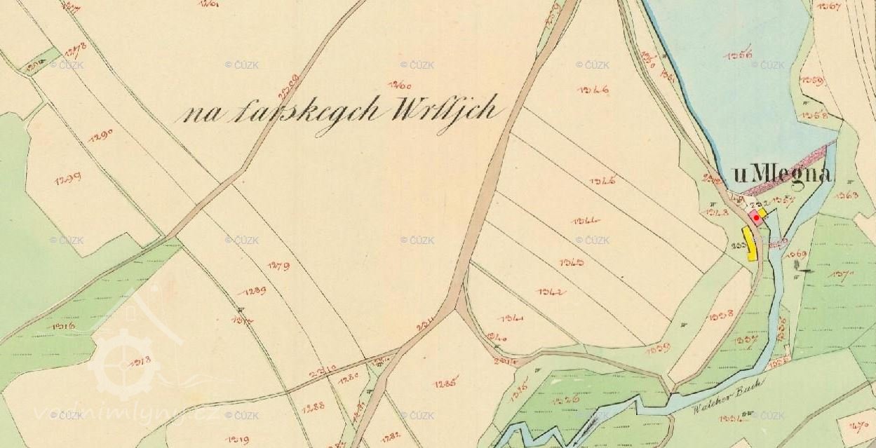 1758 František de Paula baron Gudenus, majitel Červené Lhoty emfyteuticky prodává mlýn "Volechner" o 2 složeních Ignáci Pakostovi za 400 zlatých. Mlynář bude platit 100 zl. roční činže, odvádět 5 strychů mouky, půl nádoby vepřového masa v ceně 60 zl., na robotu posílá jednoho dělníka a 1 potah. Vrchnost dodává zdarma dřevo na topení i na opravy.