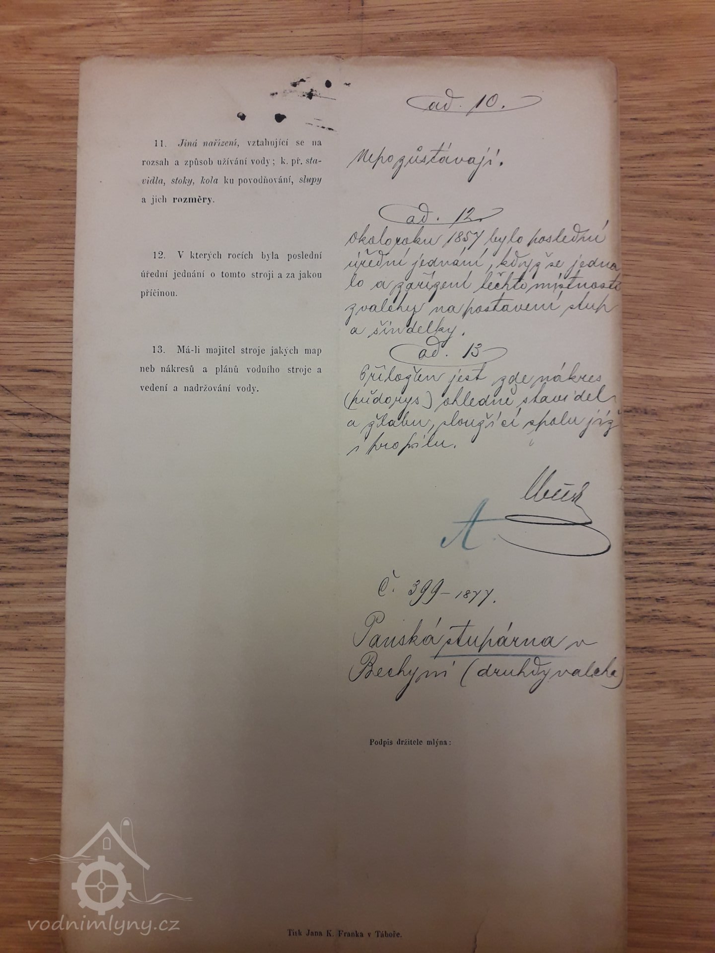 Vedle bývalé valchy, před léty změněné v mlýn na tluč (šrot) pro panské dvory, vystavěli elektrárnu. Na první pohled bylo viděti, že ji první ledy poškodí. Teprve r. 1909 ohradili ji před ledy zpředu zdí a kolo prkenným křídlem (pep)