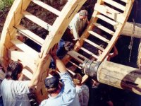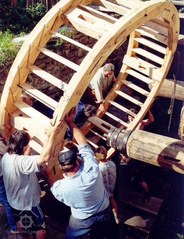 Obě současná vodní kola byla zhotovena panem Josefem Kudrnou, sekerníkem z Dolního Radíkova u Českého Rudolce. Hřídele vodních kol, tzv. vály, byly tesány z dubových kmenů získaných před léty z lužního lesa u Břeclavi pod přístřeškem dvora přímo na místě samém. Po okování byly složitě pomocí mechanismů nasoukány do otvorů proražených v návodní stěně hamerny a uloženy do ložisek, jak v hamerně, tak v lednici. Na hřídel pro pohon hamerského kladiva byl potom navlečen litý nákružek opatřený palci, které budou stlačovat dvojzvratnou páku topora hamerského kladiva, tzv. kobyly, a také oba věnce vodních kol. Věnce kol opatřené korečkovými lopatkami jsou spojeny s vály šesti rameny na dlab. Ramena v tomto případě procházejí ve vzájemném částečném přesazení hřídelem vodního kola.