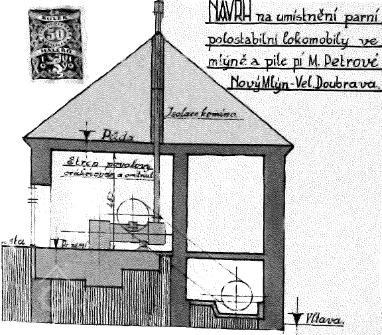 Popispro pohon mlýna a pily, výkon 20 HP, topilo se pilinami