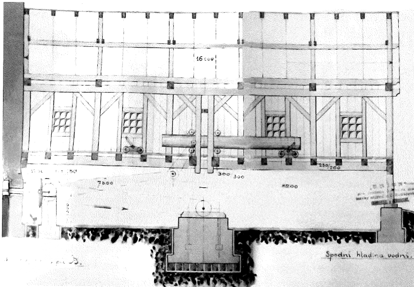 Popis1929: 2 rychloběžné Francisovy turbíny se svislou osou, 115 ot/min., hltnost 2 x 19 m3/s, spád 3,1 m, celk výkon 640 HP