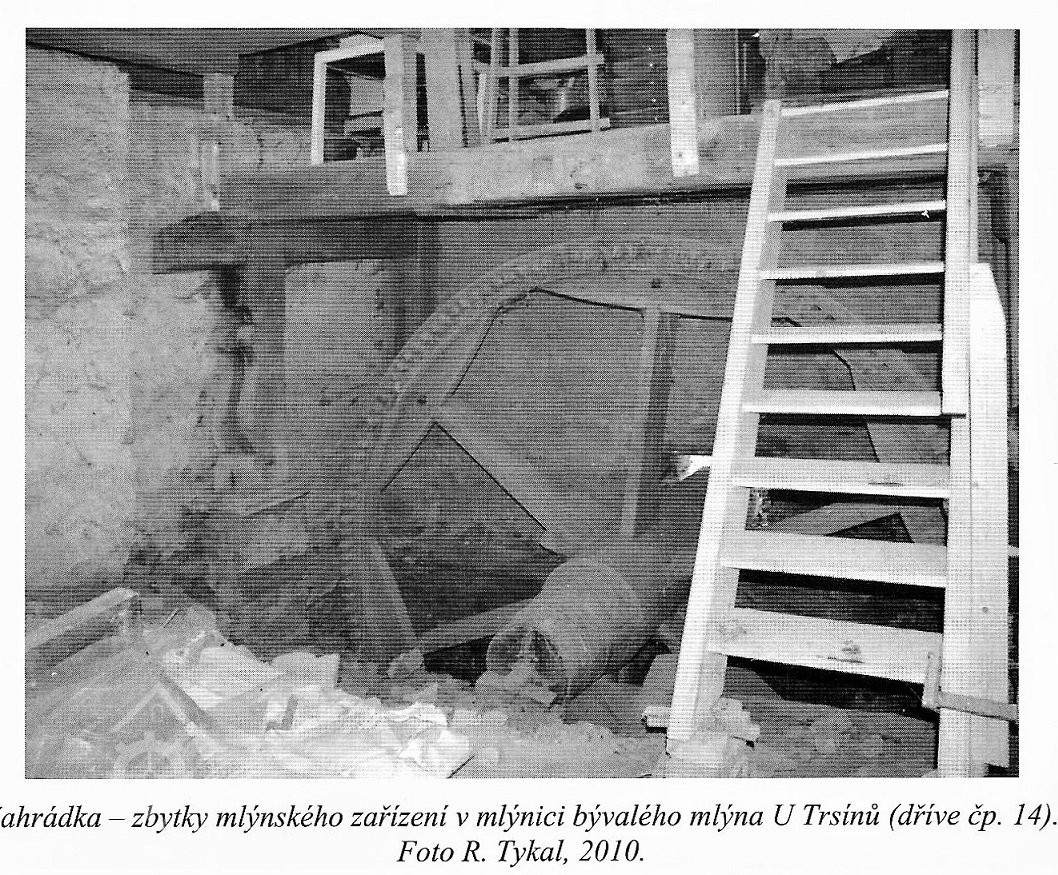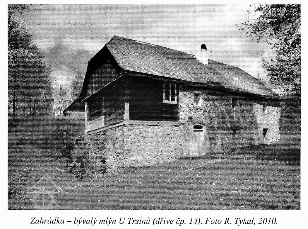 1) obytné stavení s mlýnicí 2) stodola 3) rybník Areál mlýna je situován v malebném údolí na severním okraji vesnické památkové zóny Zahrádka. Mlýn leží na nepravidelném pozemku. V současné době je tvořen dvojicí objektů, oddělených rybníčkem (akumulační nádrží), s dlouhou hrází na jihozápadní a jihovýchodní straně. Pod jihovýchodní stranou hráze je situována budova mlýna (obytné stavení s mlýnicí). Svou podélnou osou je mlýn orientován přibližně ve směru severovýchod – jihozápad, tedy rovnoběžně s potokem. Stavení je založené ve svahu tak, že z jihovýchodní strany se jeví jako patrové, zatímco ze severozápadní strany jako přízemní. Na severozápadní straně areálu stojí volně nevelká stodola, orientovaná podélnou osou ve směru severozápad – jihovýchod. Zbývající části vodního díla (náhon, odtokový kanál s jalovým přelivem a odtokový kanál z lednice) nejsou památkově chráněny (na pozemku ppč. 212). Počátky mlýna nejsou objasněné. Dnešní stavba obsahuje druhotně použité dřevěné stavební konstrukce z první třetiny 18. století – prvky barokní mlýnské hranice s jedním bohatě profilovaným sloupem a dále prvky rámové roubené stěny ze silných fošen v prostoru mlýnice. Tyto konstrukce jsou dendrochronologicky datované mezi roky 1708 – 1725 (hranice), resp. 1717 a 1727 – 1729 (roubená příčka a rámová stěna mlýnice). Zda k barokní stavební etapě patří i některé zděné konstrukce (suterén, klenby) se nepodařilo bezpečně určit, pravděpodobně jsou však až pozdější. Situace na mapě stabilního katastru z roku 1837 ukazuje pozoruhodný fakt, že objekt byl oproti dnešnímu stavu významně kratší na severovýchodní straně. Objekt byl vyznačen červeně jako nespalný. Areál doplňovala ještě stodola v dnešní poloze (značená žlutě) a především dnes již zaniklý velký objekt v podélné orientaci vůči přístupové cestě, navazující volně kolmo na stodolu na severozápadní straně areálu (rovněž značený žlutě). Tato skutečnost nás nutí zamyslet se nad funkcí jednotlivých objektů v rámci areálu. Zdá se pravděpodobné, že zaniklý objekt na severozápadní straně areálu mohl být původním obytným (roubeným) domem, zatímco oproti dnešku významně menší objekt na místě dnešního mlýna a obytného stavení byl původně jen monofunkčním mlýnem. Právě tato stavba mohla být postavena z dřevěných prvků, obsažených druhotně v dnešní konstrukci mlýnské hranice a roubení mlýnice.
