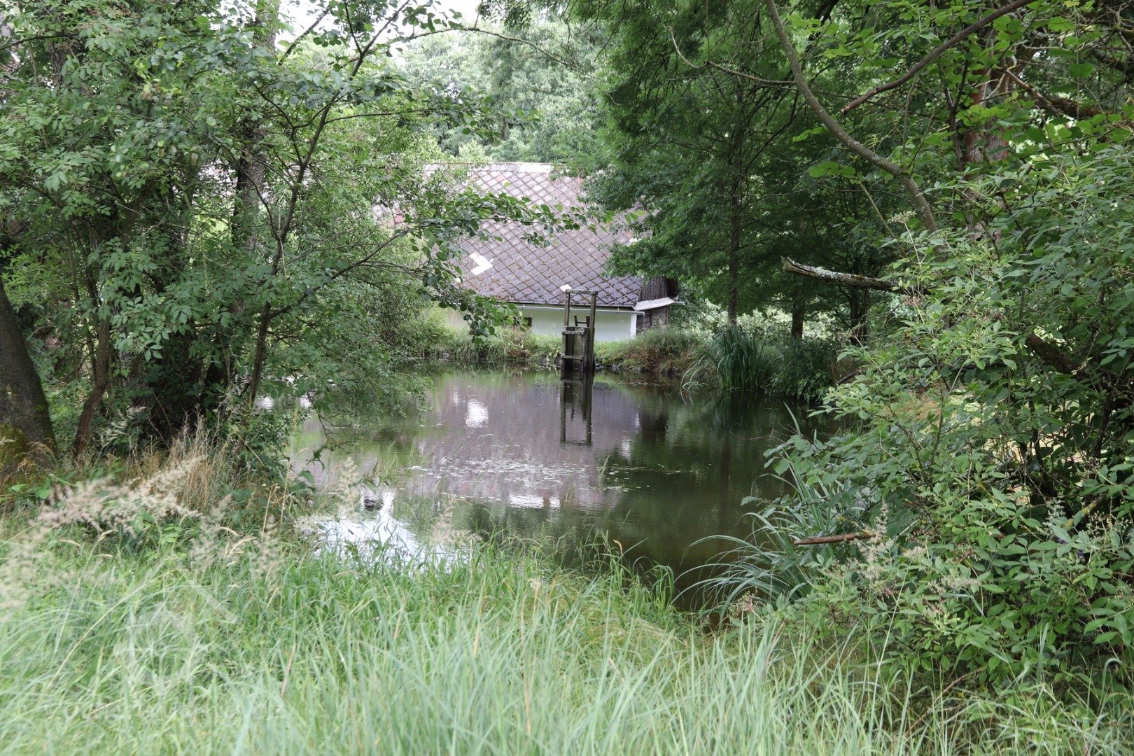 Rybník (akumulační nádrž), dochovaný v přirozené podobě bez novodobých úprav, představuje nedílnou funkční součást areálu mlýna. Hodnotným detailem je kamenný žulový žlab, vedoucí původně na vantroky. Díky vodní ploše se zatravněnou hrází se celý areál mlýna uplatňuje mimořádně příznivě v kontextu okolní krajiny i prostředí VPZ Zahrádka.“