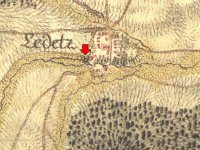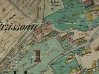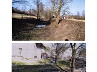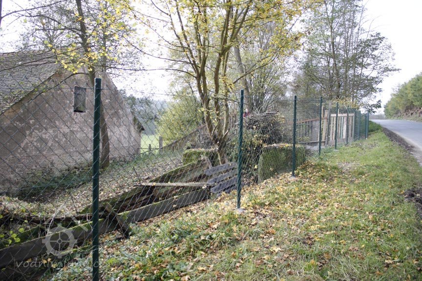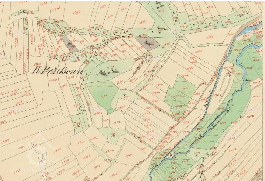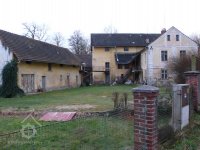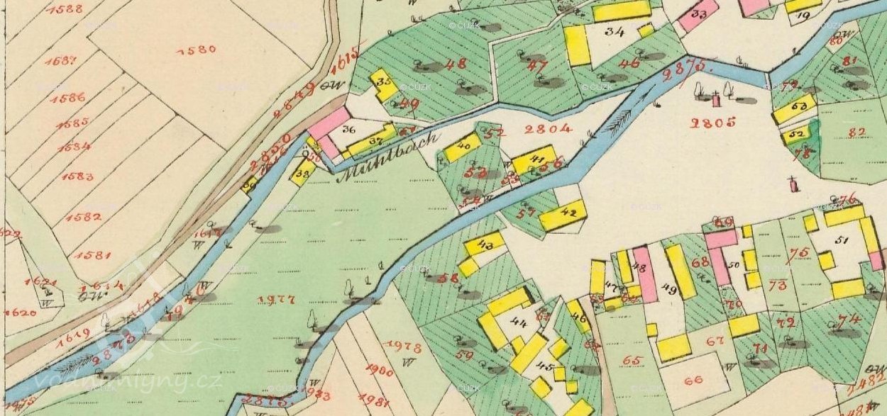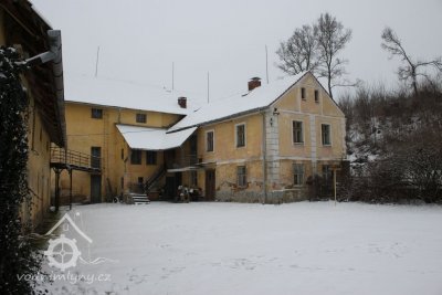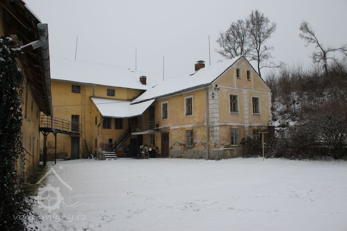 1) obytné stavení s mlýnicí 2) náhon 3) stodola 4) bývalé chlévy