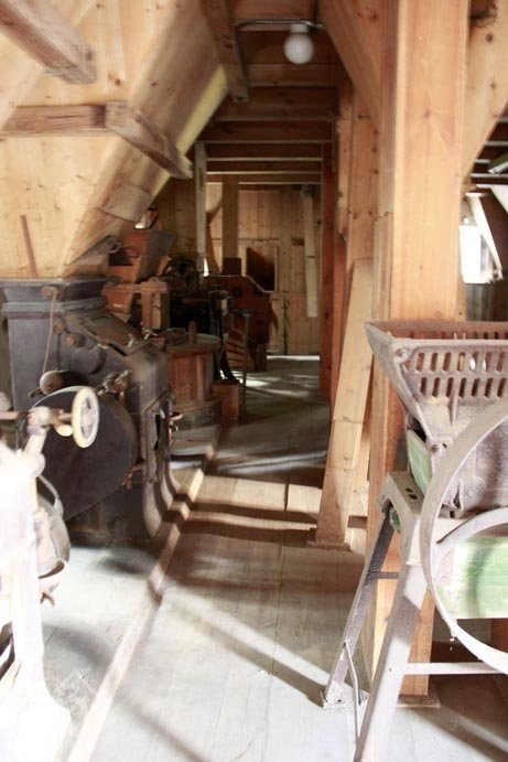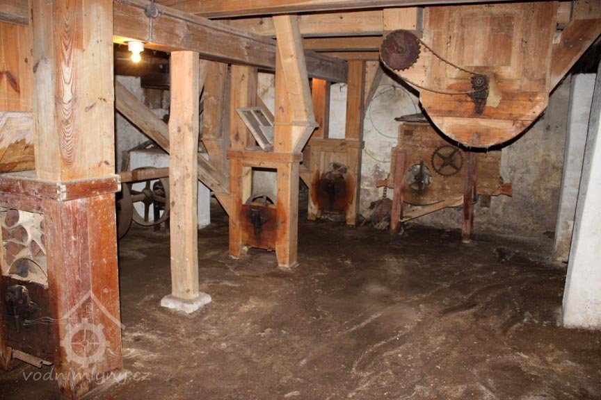V přízemí mlýnice obdélný prostor s trámovým stropem neseným třemi průvlaky (krajními a středovým) uloženými na přízedních polopilířích. Vlevo za vstupem stoupá do patra dřevěné schodnicové schodiště bez podstupme. Vstupní otvor v hluboké mírně se rozevírající špaletě se segmentovým záklenkem. Vlevo od vstupu malé dvojité dřevěné okénko s bambulkovými závěsy, vnitřní okno chybí, špaleta mírně rozevřená ukončená segmentovým záklenkem. V západní stěně naproti vstupu nika ukončená segmentovým obloukem (snad zrušený otvor?) a vpravo do ní předstupuje před líc zdi blok zdivá lednice a před ním základové patky pro stroj, ještě před nimi osazen malý elektromotor. V severní části přízemí mlýnice při západní stěně otvor od Francisovy turbíny a u něj předlohová transmise na ložiskových kozlíkách a při ní regulace turbíny a pohon kamenného složení přes polozkřížený převod a rolny od transmise. Při protější stěně vystupuje pata kapsového dopravníku a podavač. První patro má prkennou podlahu a trámový strop podporovaný středovým průvlakem, stropnice uloženy na ústupek zdivá. Otvory mají špalety ukončené segmentovým záklenkem. Špalety oken mají odsazenou poprseň, okno ve druhé ose od severu má špaletu zcela bez poprsně. V severní stěně při východním koutu je okénko s výrazně vyloženou dřevěnou parapetní deskou (zapisovací místo pro evidenci mletí). Otvor má mírně se rozevírající špaletu bez poprsně a ukončen je segmentovým záklenkem. V blízkosti zapisovacího místa zabudována do prkenné podlahy váha. V severní části východní stěny je široký segmentem ukončený vstup do prostor zasahujících do hmoty obytné části, jedná se o plochostropou místnost se vstupem k silnici a s jedním okénkem. Strop má prkenný podhled opatřený hladkou omítkou na rákos, podlaha prkenná. Ve východní stěně pravoúhlá odkládací nika, v jižní stěně vstup do přístavku situovaný v mělké špaletě ukončeně segmentovým obloukem a s jednokřídlými rámovými dveřmi s prosklenou horní polovinou členěnou příčlemi. Některé výplně otvorů patra mají dochované vnitřní okenice.