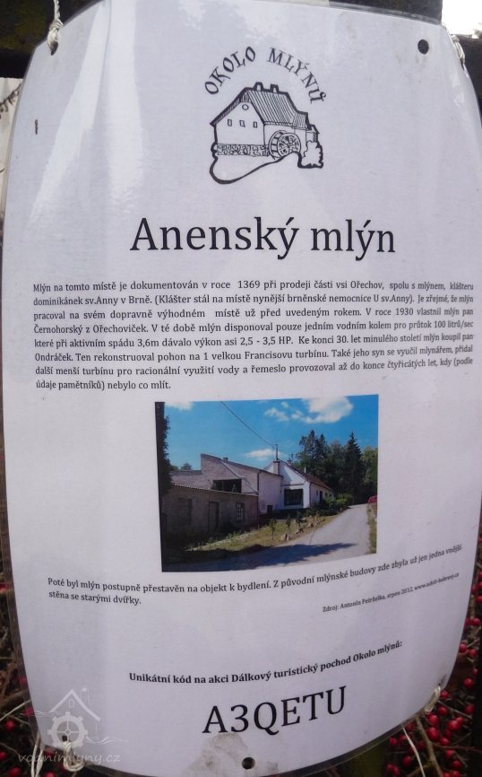 Mlýn je prvně připomínán v roce 1369 v souvislosti s jeho prodejem spolu s obcí Ořechov dominikánkám kláštera sv. Anny v Brně.