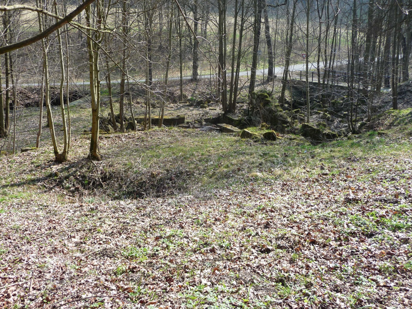 Z mlýna zbyla zřícenina hluboko pod cestou. Voda v náhonu dodnes přitéká do bývalé lednice.