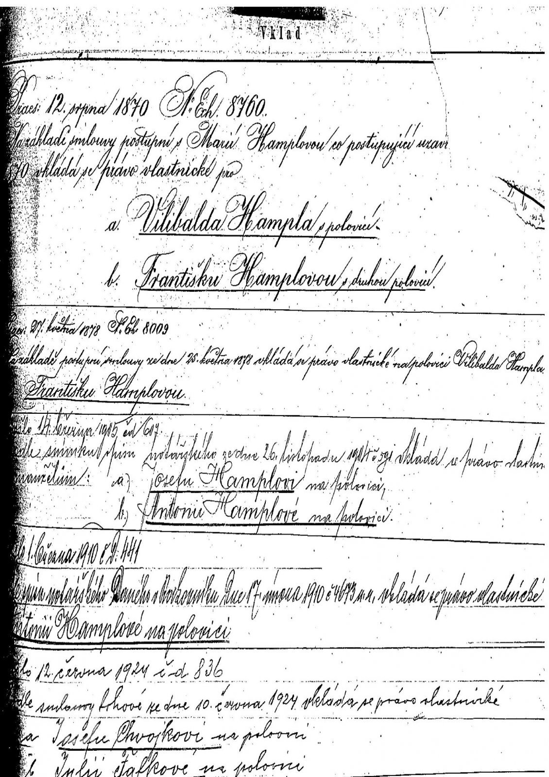 1910 - Josef Hampl převádí svůj díl mlýna na manželku Antonii, která je jediným vlastníkem mlýna.
