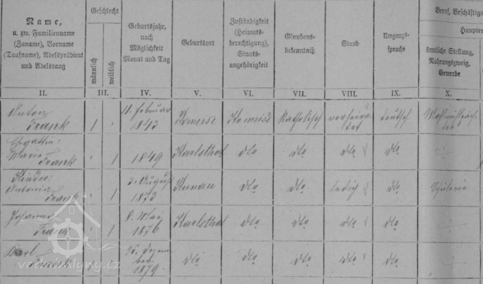 Do roku 1879 mlýn vlastní Josepha Langer. V roce 1880, 1890 a 1900 mlýn vlastní mlynář Anton Frank nar. 1843, manželka Rosa nar. 1962.