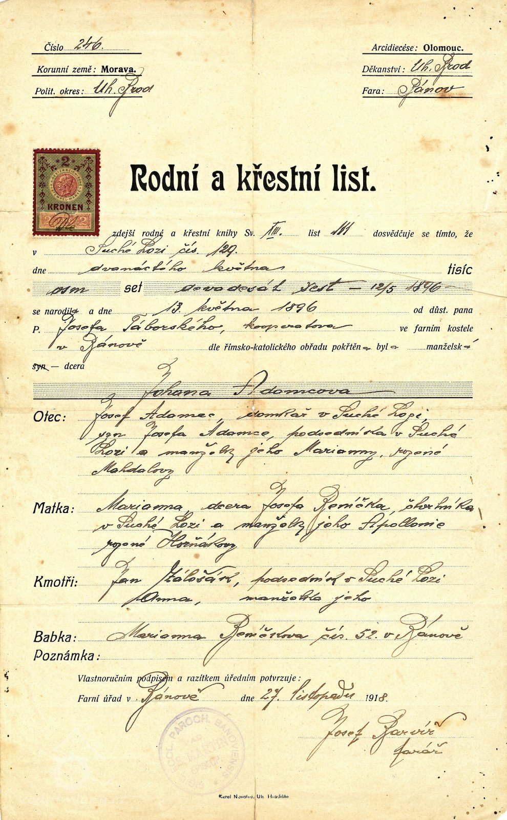 r. 1924 - majiteli mlýna č. 33 Johanna Velecká rozená Adamcová narozena r.1896 vdova po Martinu Veleckém a jejich dcera nezletilá Marie Velecká narozena r. 1919