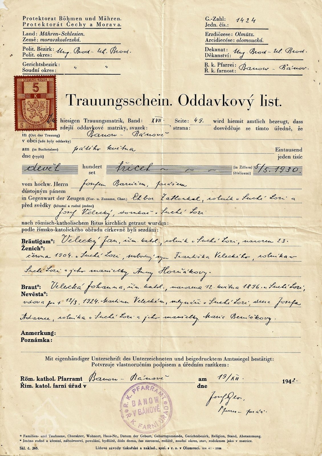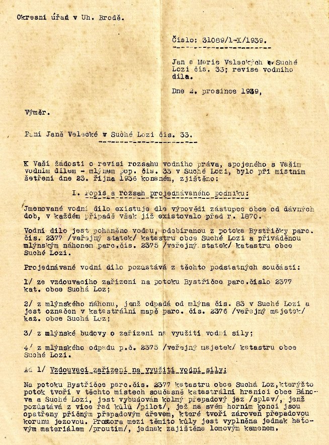 r. 1939 - majiteli mlýna č. 33 manželé Jan Velecký narozen r. 1904 a Johanna Velecká rozená Adamcová narozena r. 1896