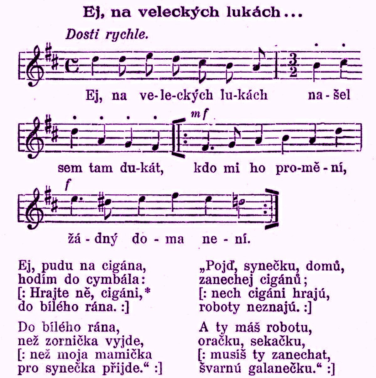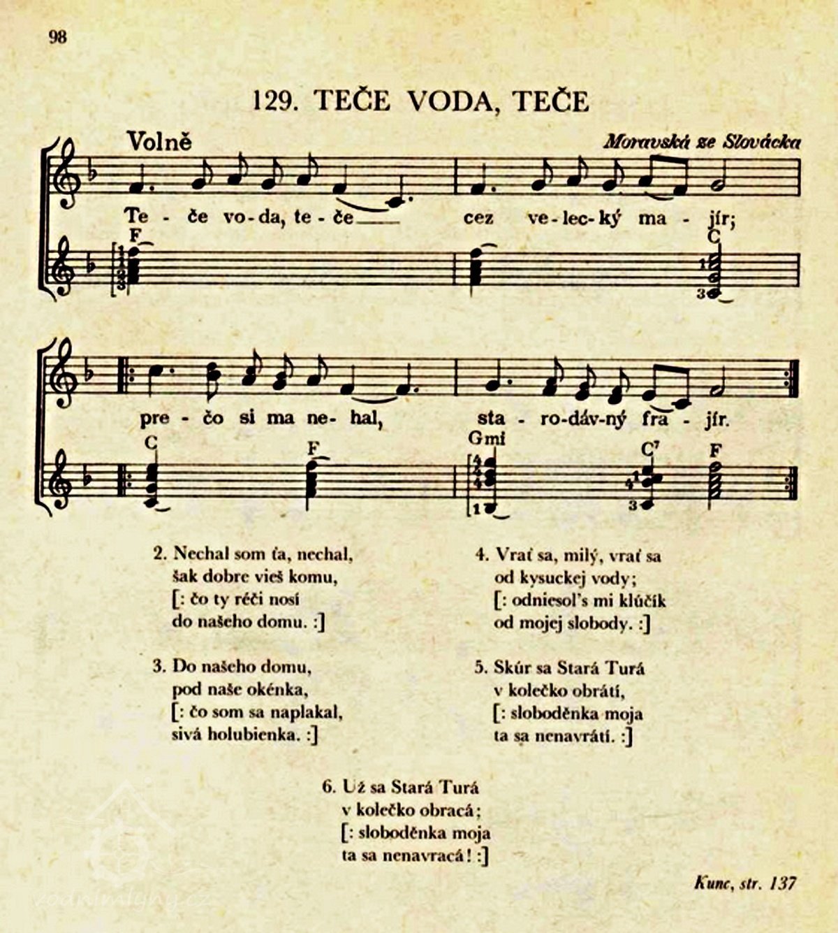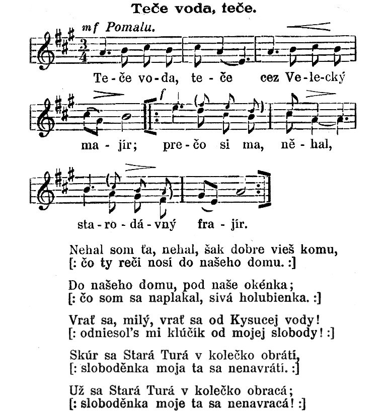 V tomto již zmiňovaném období zde také podle dochovaných záznamů vznikla zcela určitě nejznámější píseň: „Teče voda, teče cez Velecký majír“ která se váže k budově mlýna č. 33 a jeho vodnímu náhonu, který protékal 190 m dlouhým kanálem přes celý Velecký majír (statek) až k samotnému mlýnu. Slovo majír, které se v té době v místním nářečí používalo k označení statku či velkostatku, pochází z německého Meierhof. Podrobnější vysvětlení nářečného výrazu „velecký majír“ najdete zde: https://cs.wiktionary.org/wiki/maj%C3%ADr Tato píseň, jak se s přibývajícím časem i oblibou šířila, postupně zlidověla jak v Čechách, tak i na blízkém Slovensku a zároveň se také později stala velice oblíbenou písní prezidenta T. G. Masaryka, moravského rodáka z nedalekého Hodonína. Často pak byla hrána na počest panu prezidentovi při různých oficiálních státních návštěvách v zahraničí, čímž se stala i světově známou. Píseň „Teče voda, teče cez Velecký majír“ si můžete s laskavým svolením zpěvaček paní Hany Buštíkové a Dany Vlkové, Duo Kamelie, poslechnout zde: https://www.youtube.com/watch?v=eFH1uTS6h38
