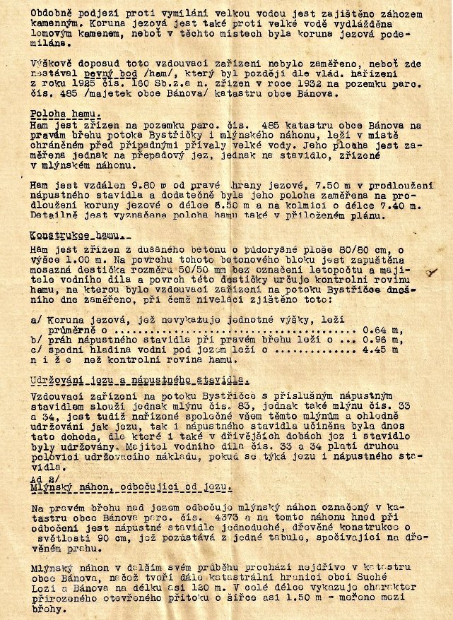 Mlynářství zde ve mlýně č. 33, stejně jako na jiných mlýnech, tou dobu obnášelo velice náročnou živnost. V případě mlynářského rodu Veleckých se toto řemeslo dědilo z generace na generaci po celá staletí. Potomci těchto mlynářů již od útlého mládí získávali mnohdy pracně nabyté zkušenosti od svých otců a praotců, mlynářských mistrů. Přesto všichni Velečtí mlynáři prošli tříletou učňovskou dobou a složili náročné zkoušky, při nichž byli povinni prokázat, že umí nejenom mlít obilí, ale hlavně také mlýn postavit, vše do něj zhotovit a mlýn také i vystrojit. To obnášelo jak znalosti s užitím a opracováním dřeva, tak i s finálním opracováním mlýnských kamenů. Při zkoušce museli rovněž prokázat, že umí ke mlýnu přivést vodu, což se neobešlo bez základních vědomostí o hydrologii, vodních tocích, měření, výpočtech, ale třeba i o základech mechaniky a fyziky. Po úspěšně vykonané zkoušce před zkušební komisí jmenovanou mlynářským cechem se teprve stali mlynářskými mistry a následně byli zapsáni do knihy cechu mistrů mlynářských, kraje Hradišťského. Na základě takto prokázaných odborných znalostí získali všichni mlynářští mistři rodu Veleckých oprávnění užívat ve svém erbu znak mlynářského cechu, což představovalo pro všechny příchozí zákazníky punc mlynářské kvality v tomto mlýně. Za mletí měřice pšenice na mouku se zde platila částka jednoho krejcaru, ječmene na hrubé kroupy za jeden a půl krejcaru, na malé kroupičky po třech krejcarech a prosa po půl druhém krejcaru. Každý šestnáctý díl obilí byl osvobozen od jakýchkoliv poplatků, neboť tento díl vždy připadal vrchnosti. Pokud si sám zákazník neposlal do mlýna čeládku na pomocné práce při mletí obilí, účtoval se v tomto mlýně ještě poplatek za každou měřici jeden krejcar navíc. Mlynářský mistr Jiří Velecký pak z tohoto mlýna odváděl vrchnosti daň a to z jednoho mlýnského vodního kola nebo palečného kola 2 zlaté moravské, za pohon vrchního mlecího kamene běhounu a spodního mlecího kamene valounu rovněž 2 zlaté moravské, od hřídele či válce 2 zlaté moravské a od nového koše taktéž 2 zlaté moravské. Později se daň z tohoto mlýna vyměřovala podle jeho vodní síly. Ta se určovala na základě velikosti množství protékající vody mlýnským náhonem přepočtené na tzv. hodinové koňské síly zdanitelné, z nichž pak byla daň následně odváděna příslušným úřadům. Vzdouvací zařízení na využití vodní síly bylo tvořeno kolmým přepadovým jezem, který byl vybudován v řečišti potoku Bystřička (Nivnička). V těchto místech také potok tvořil současně katastrální hranici obce Bánova a Suché Lozi. Konstrukce kolmého přepadového jezu (splavu) byla tvořena z více řad kůlů (základových pilotů), které na svém horním konci byly opatřeny přepadovým dřevem, které zároveň i tvořilo přepadovou korunu jezovou. Prostory mezi těmito kůly byly vyplněny jednak haťovým materiálem (proutím), jednak zajištěny lomovým kamenem. Obdobně bylo podjezí zajištěno proti vymílání velkou vodou kamenným záhozem. Koruna jezová byla taktéž proti velké vodě vydlážděna lomovým kamenem, neboť v těchto místech byla koruna jezová často podemílána. V minulosti nebylo toto vzdouvací zařízení zaměřeno, neboť zde nestával pevný bod (ham). Tento byl zřízen až v roce 1932 na základě vládního nařízení z roku 1925 čís. 160 Sb.z.a n. Ham byl zřízen na pravém břehu potoka Bystřičky i mlýnského náhonu a ležel v místě chráněném před případnými přívaly velké vody. Jeho poloha byla zaměřena jednak na přepadový jez, jednak na stavidlo, zřízené v mlýnském náhonu. Ham byl vzdálen 9,80 m od pravé hrany jezové, 7,50 m v prodloužení nápustného stavidla a dodatečně byla jeho poloha zaměřena i na prodloužení koruny jezové o délce 5,50 m a na kolmici o délce 7,40 m. Ham byl postaven z dusaného betonu o půdorysné ploše 80/80 cm, o výšce 1,00 m. Na povrchu tohoto betonového bloku byla zapuštěna mosazná destička rozměru 50/50 mm bez označení letopočtu a majitele vodního díla. Povrch této destičky pak určoval kontrolní rovinu hamu, na kterou bylo vzdouvací zařízení na potoce Bystřička zaměřeno. Na pravém břehu nad jezem odbočoval mlýnský náhon vpravo a hned při tomto odbočení bylo nápustné stavidlo jednoduché, dřevěné konstrukce o světlosti 90 cm, které se skládalo z jedné tabule spočívající na dřevěném prahu. Mlýnský náhon v dalším průběhu směřoval přímo až ke mlýnu č. 83 a od něho pak přes celý Velecký majír (statek) až ke mlýnu č. 33. Společný náhon pro mlýny č. 33 a č. 34 byl tedy veden od mlýna č. 83 jako jeho odtokový kanál. Ten má dodnes charakter otevřeného příkopu a je dlouhý 190 m. V nejužším místě má šířku 1,4 m a v nejširším místě (asi 70 m nad mlýnem) je jeho šířka 2,9 m a hloubka 0,5 m. Bezprostředně před mlýnem č. 33 přecházel mlýnský náhon do dřevěných vantrok o celkové světlosti 1,50 m. Na konci byly tyto vantroky opatřeny dvěma pracovními stavidly a jedním stavidlem jalovým. Levé stavidlo bylo dřevěné o světlosti 35 cm a vedlo vodu na levé vodní kolo patřící ke mlýnu č. 33. Při pravé straně dřevěných vantrok bylo umístěno jalové stavidlo taktéž dřevěné konstrukce na společném prahu s pracovním stavidlem vykazujícím světlost 30 cm. Vodní cejch t.j. značka jak vysoko směla být nadržována horní hladina vodní při tomto mlýně č. 33 zřízena nebyla, neboť tato výška horní vody byla dána jednak přepadní hranou jalového stavidla, jednak hloubkou vody nad prahem pracovního stavidla, tato výška