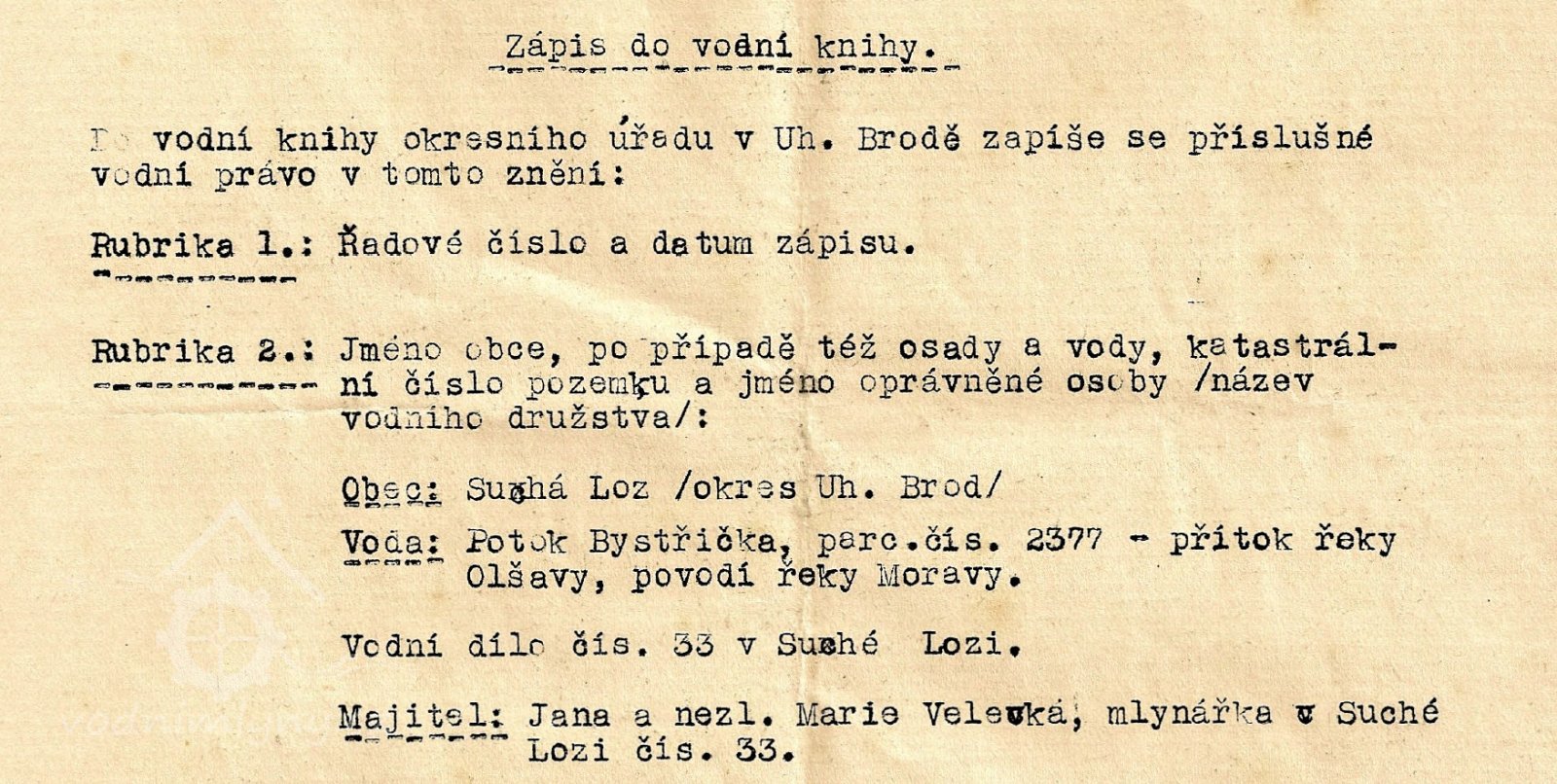r. 1952 - majitelkou mlýna č. 33 Johanna Velecká rozená Adamcová narozena r. 1896 vdova po Janu Veleckém