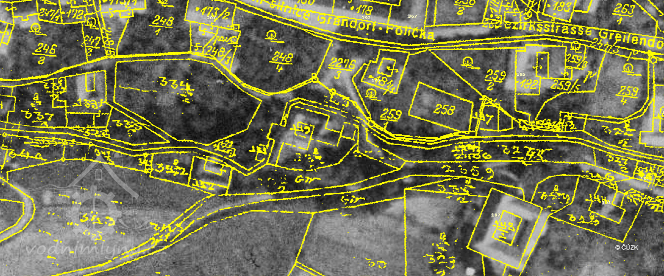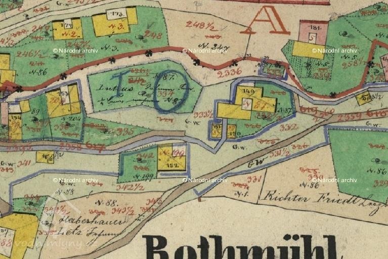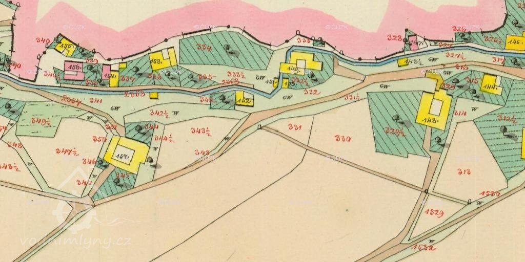 První čp. mlýna v roce 1835 bylo 87. Po přečíslování v roce 1890 měl mlýn čp. 108.