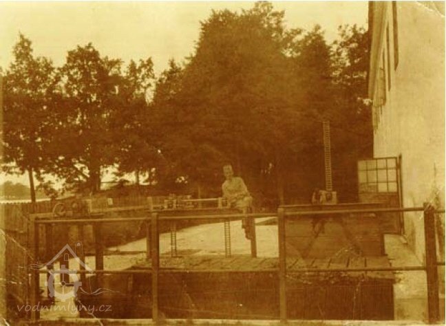 průčelí a západní část mlýna, s dveřmi z mlýnice ke stavidlům, můstkem přes náhon, šoupačkou z patra, cca poč. 20. st., © z archivu rodiny Břeských (Vojtěšky Försterové)