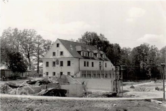mlýn z jihozápadu při přestavbě, 1960-62, © Karel Skopal st., z publikace R. Novákové "Opatovický mlýn na Zlaté stoce u Třeboně"