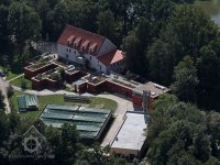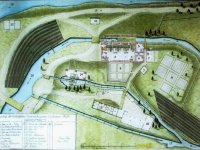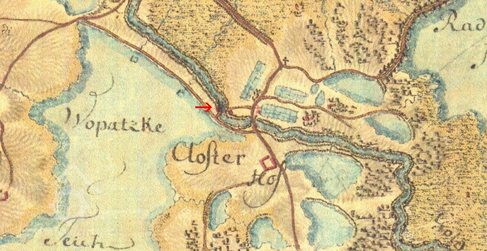 výřez z mapy - nejstarší zachované vyobrazení objektu Op. mlýna, 1684, © Mapa třeboňského panství z r. 1684 (se dvěma pohledy na Třeboň - od východu a západu); renovováno 18