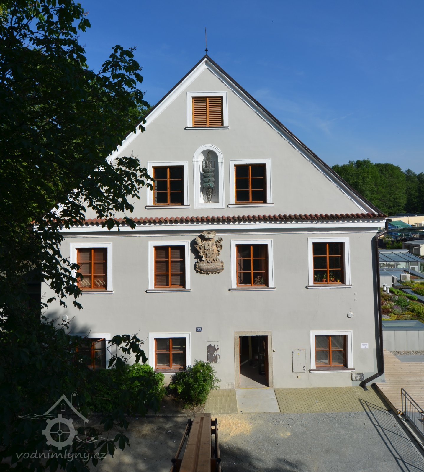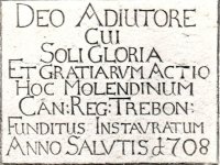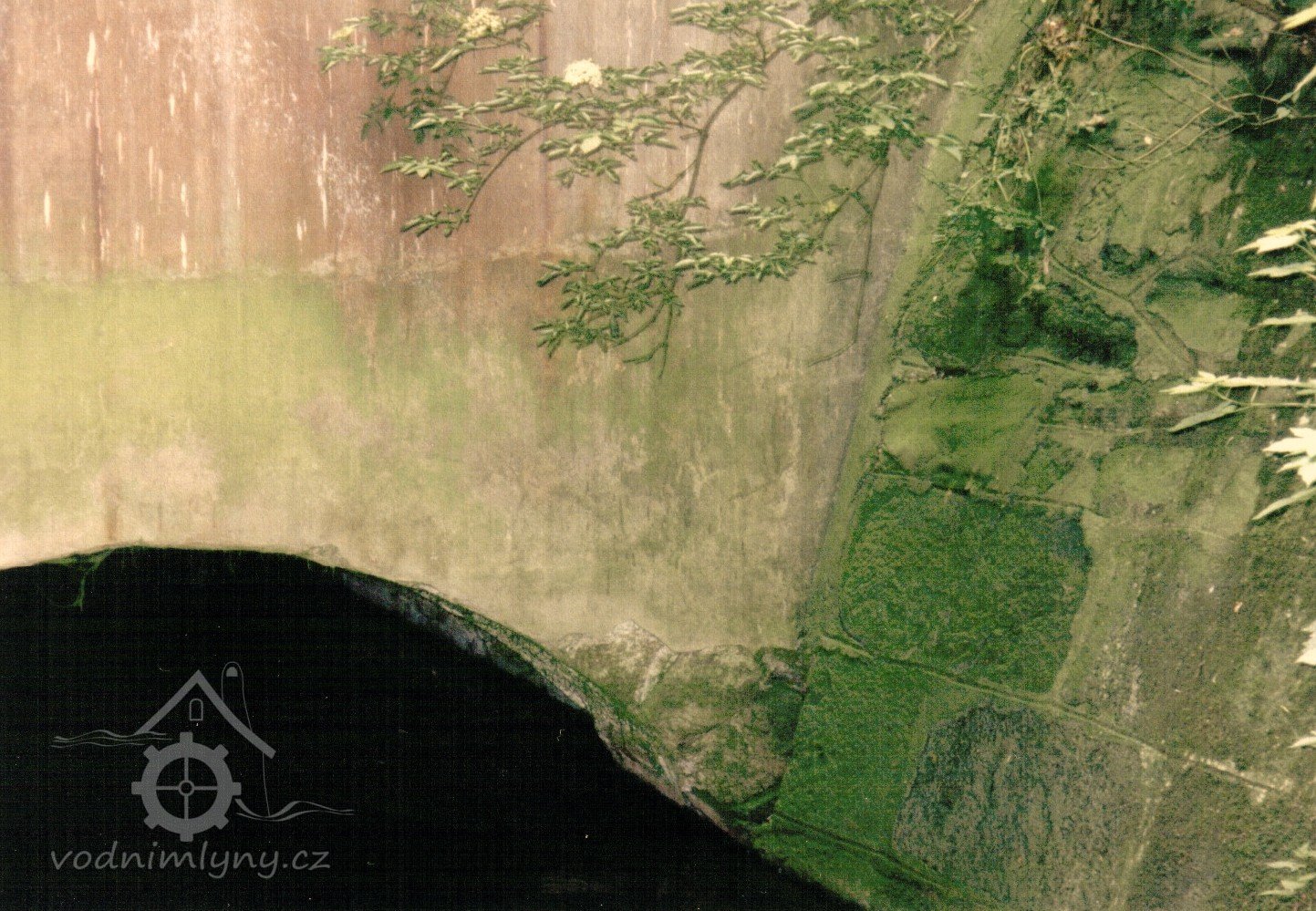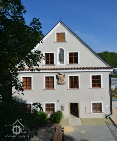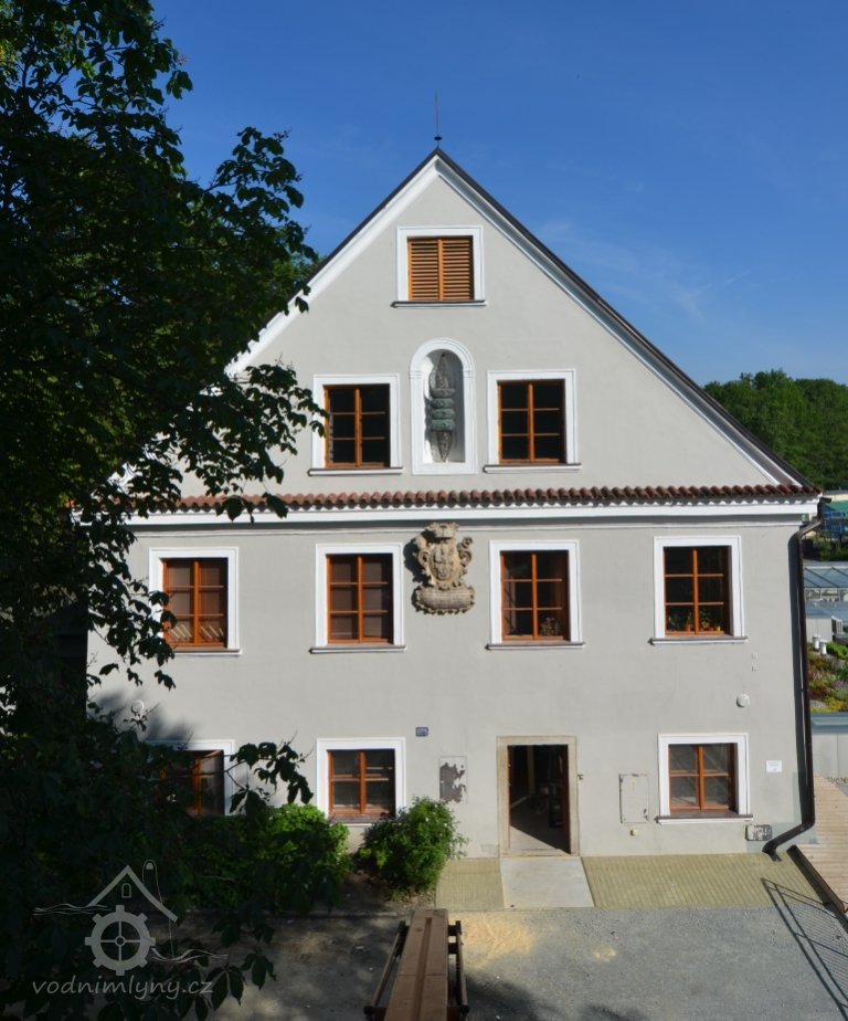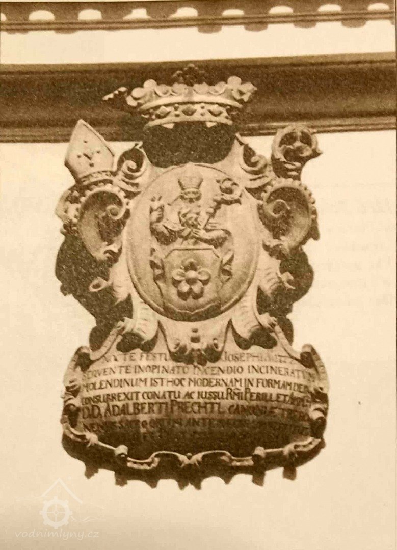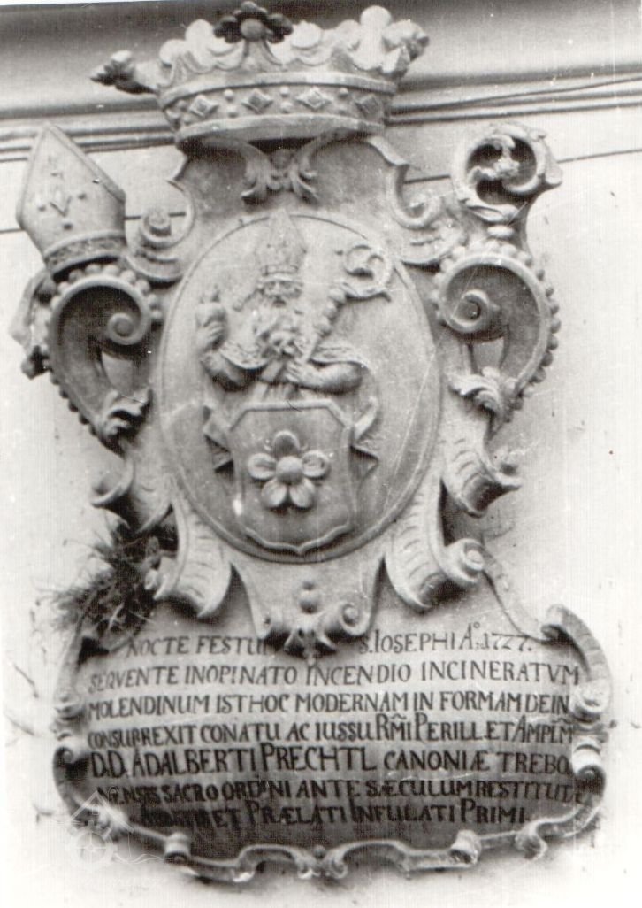 Průčelí mlýna se zakládacím nápisem z roku 1727, 1999, © Jaroslav Kopecký, (Prvky na obrázku: epigrafické památky (nápisy, datování aj.), umělecké prvky (sochy, malby, reliéfy), kamenické prvky barokní a mladší)