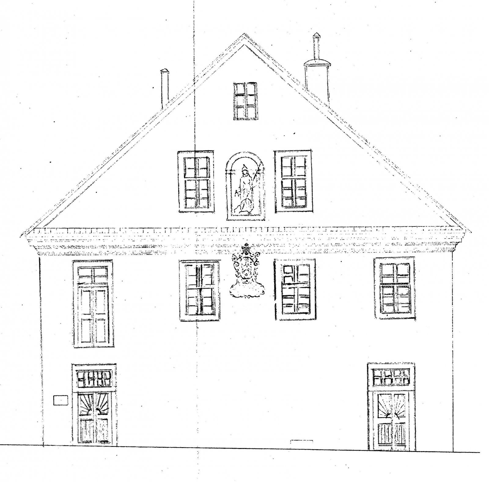 Pohled na opravené jižní průčelí, nedatováno, © autor neznámý, viz http://www.alga.cz/, (Prvky na obrázku: plastická omítková výzdoba fasád a štítů, umělecké prvky (sochy, malby, reliéfy), kamenické prvky barokní a mladší)