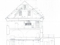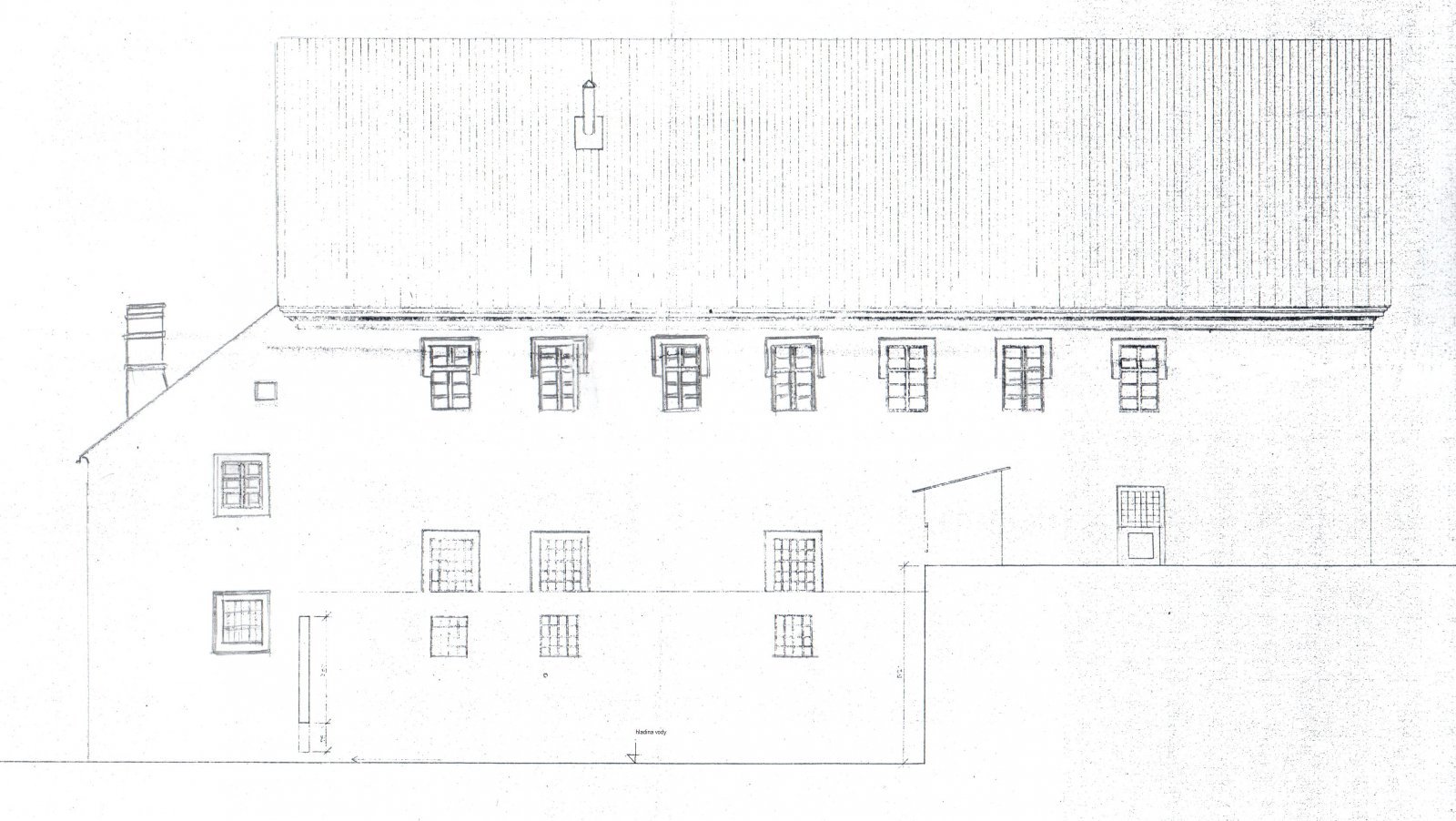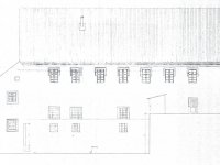 podkroví před přestavbou; mezi okny černý čtvereček: uchycení sochy Floriánka umístěné ve výklenku v průčelí, 1960-62, Karel Skopal st., z publikace R. Novákové "Opatovický mlýn na Zlaté stoce u Třeboně"
