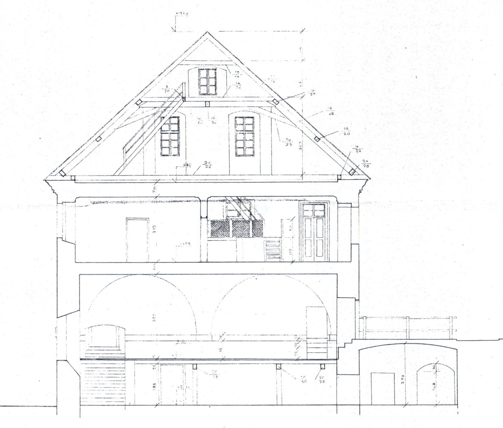 příčný řez budovou mlýna, 22. 9. 1960, © Státní projektový ústav pro výstavbu měst a vesnic (SPÚVMV) v Č.B. (1960): číslo zakázky 00650 (zpra