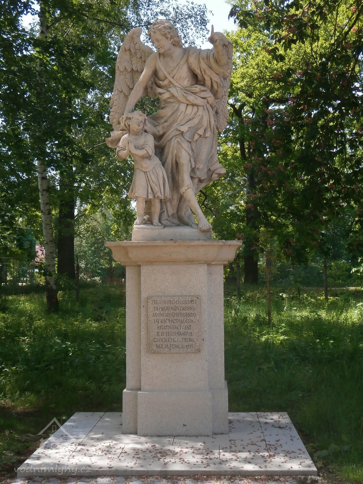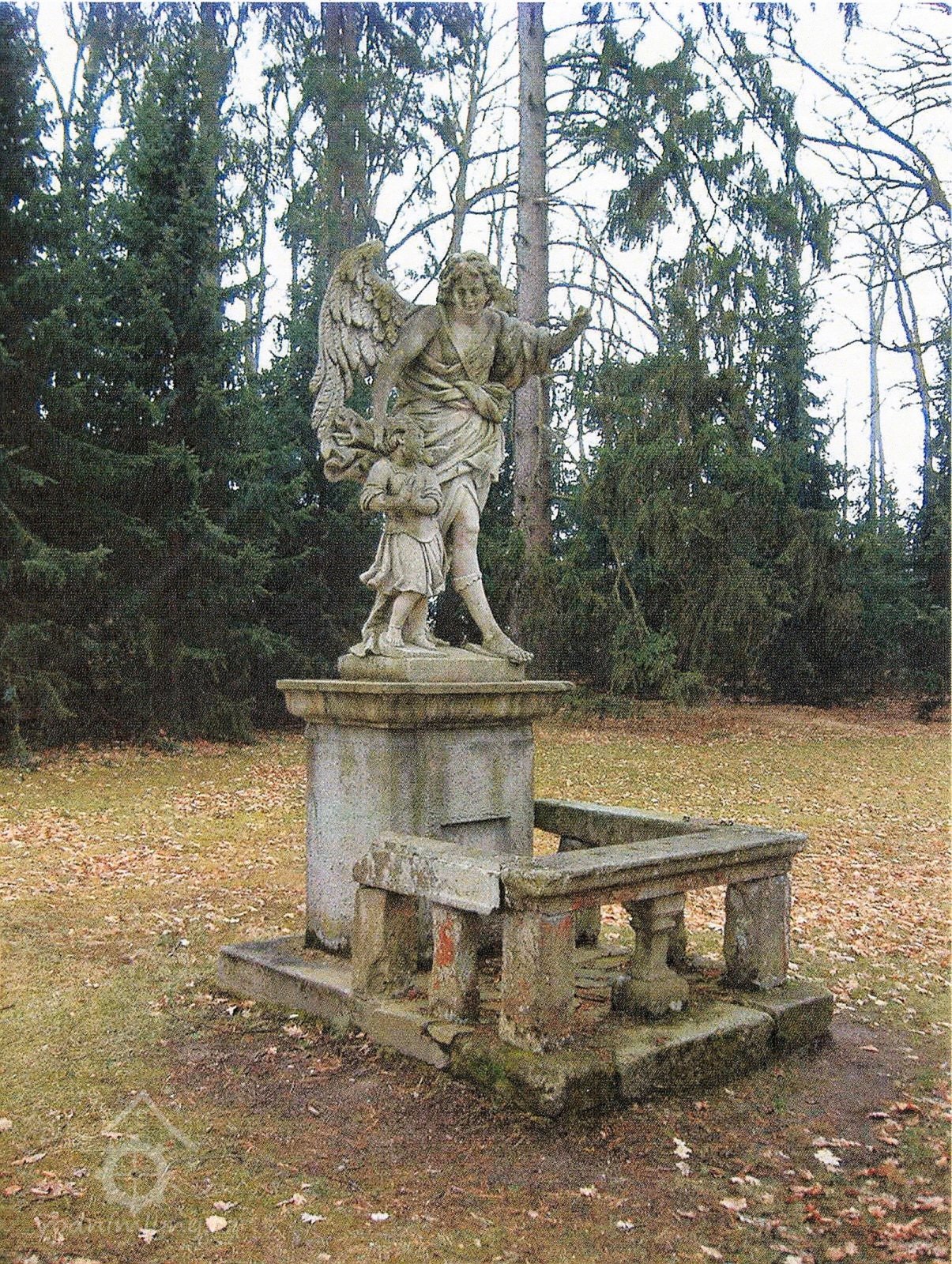 Restaurovaná socha Anděla strážce, v zahradě v místě břehu zasypané části náhonu, 2014, © Štěpán Kubín, (Prvky na obrázku: drobné sakrální památky)