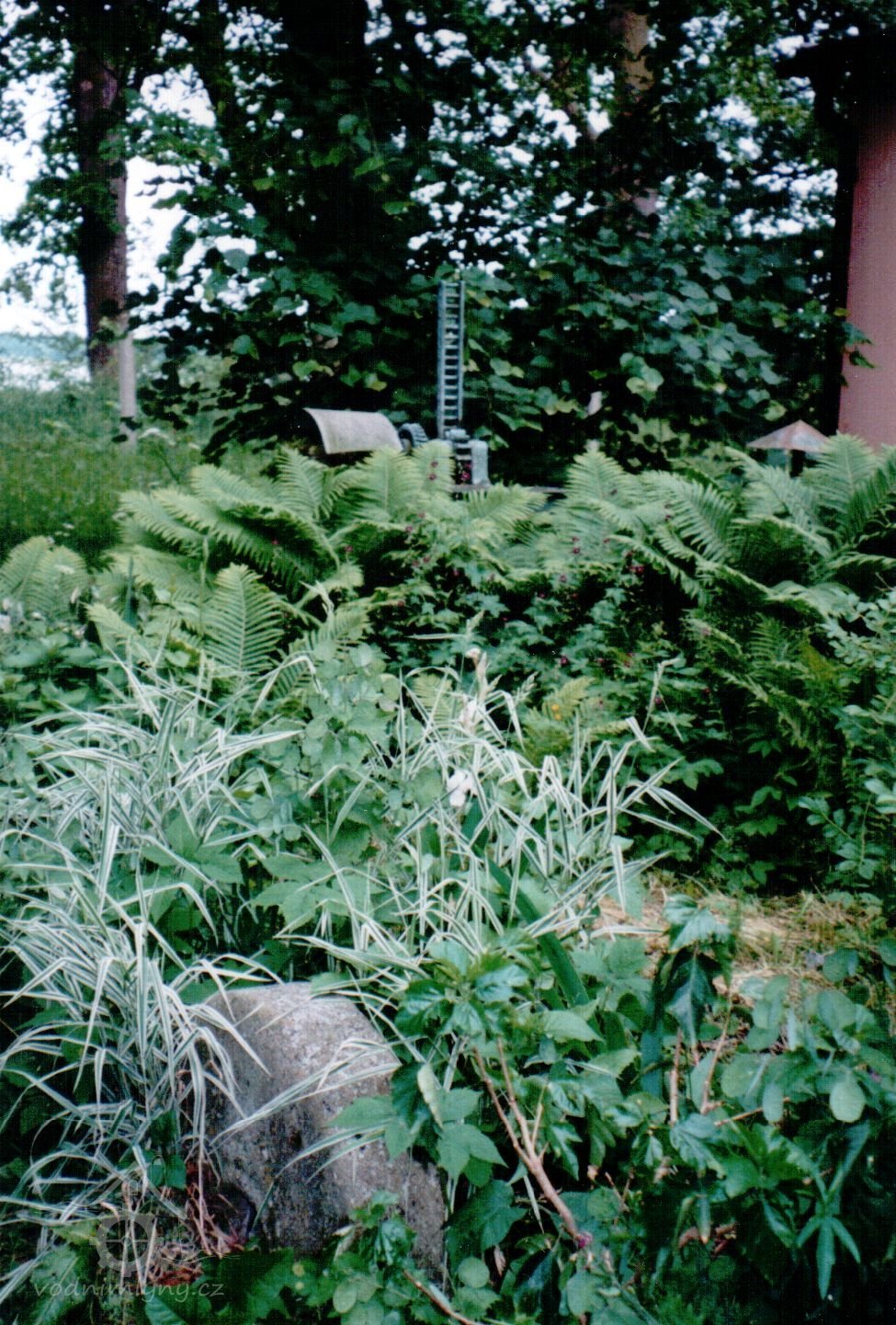 Václav Břeský s manželkou v zahradě před severovýchodním rohem mlýna, cca 1910, foto archiv rodiny Břeských, z publikace R. Novákové "Opatovický mlýn na Zlaté stoce u Třeboně"