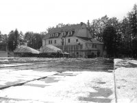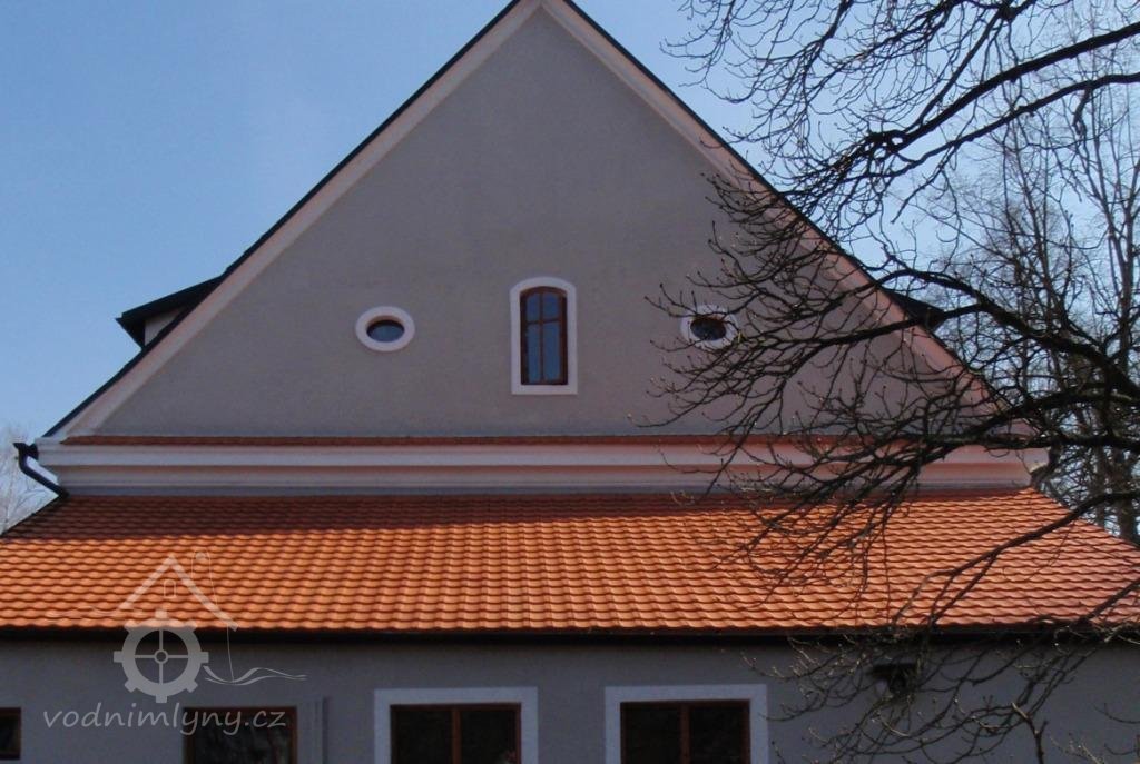podkroví před přestavbou; mezi okny černý čtvereček: uchycení sochy Floriánka umístěné ve výklenku v průčelí, 1960-62, © Karel Skopal st., z publikace R. Novákové "Opatovický mlýn na Zlaté stoce u Třeboně"