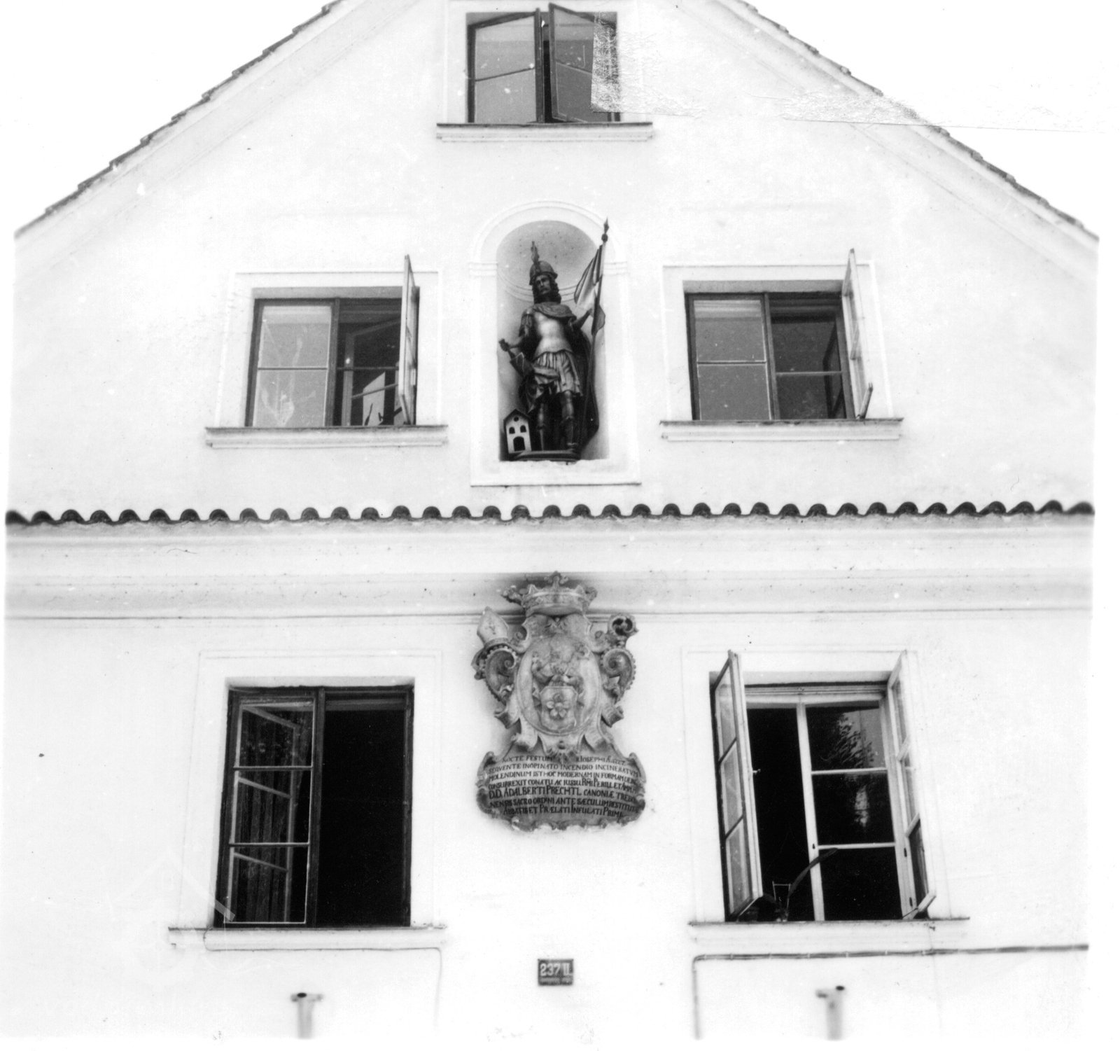 socha Floriánka, která stávala ve výklenku v průčelí mlýna, 1960-62, © Karel Kopal st.