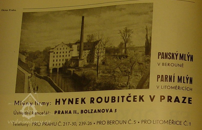 Mlýn postavil v letech 1852–1853 August Conrath (1814–1871) se svými bratry Emanuelem a Josefem, sklářskými podnikateli z Kamenického Šenova. Mlýn měl umělecké složení a již před rokem 1858 také parní pohon – po mlýně v Lovosicícha na Smíchově jako jeden z prvních v Čechách. Dne 7. března 1904 byli dědicové podniku nuceni provoz ukončit a mlýn nabídnut k prodeji – tehdy měl roční kapacitu 6 000 tun a dva parní stroje 50 a 30 HP. Zakoupila jej smíchovská konkurence, firma Ignaz Roubitcek, která provozovala také panský mlýn v Berouně a mlýny v Terezíně, a již po smrti zakladatele Ignaze Roubitcka (1833–1900) vlastnil podílník Max Bloch. Provoz byl záhy obnoven a pokračovali v něm (s přestávkou roku 1923) i dědicové firmy Quido a Konrád Bloch, kteří roku 1933 zadali pražské kanceláři Konstruktiva projekt nové parní kotelny a strojovny. V květnu 1938 se jim převodem na akciovou společnost podařilo mlýny firmy Hynek Roubitcek prodat. Mlýn v Litoměřicích je v provozu dodnes, produkcí 300 tun denně je největším v České republice.