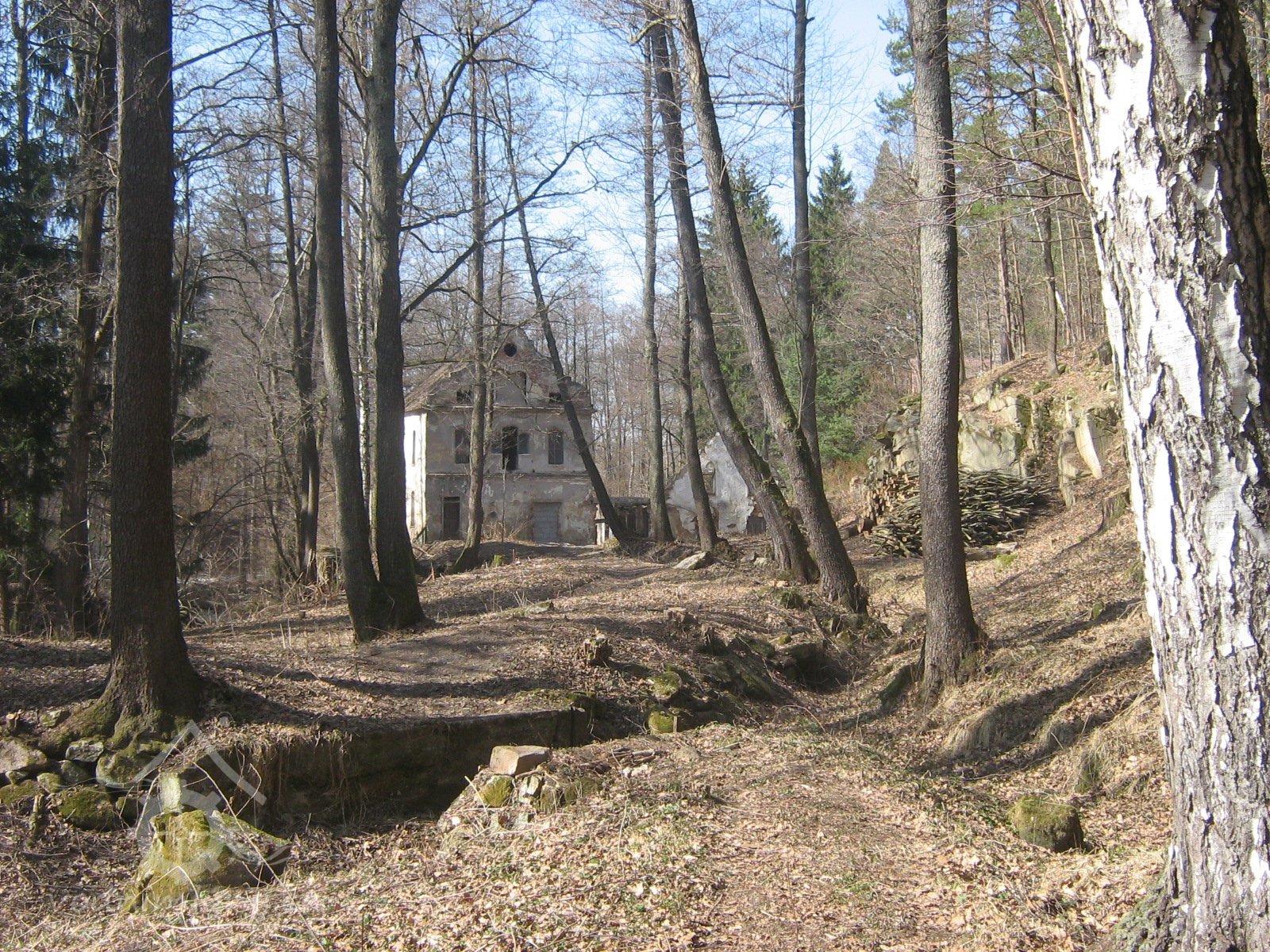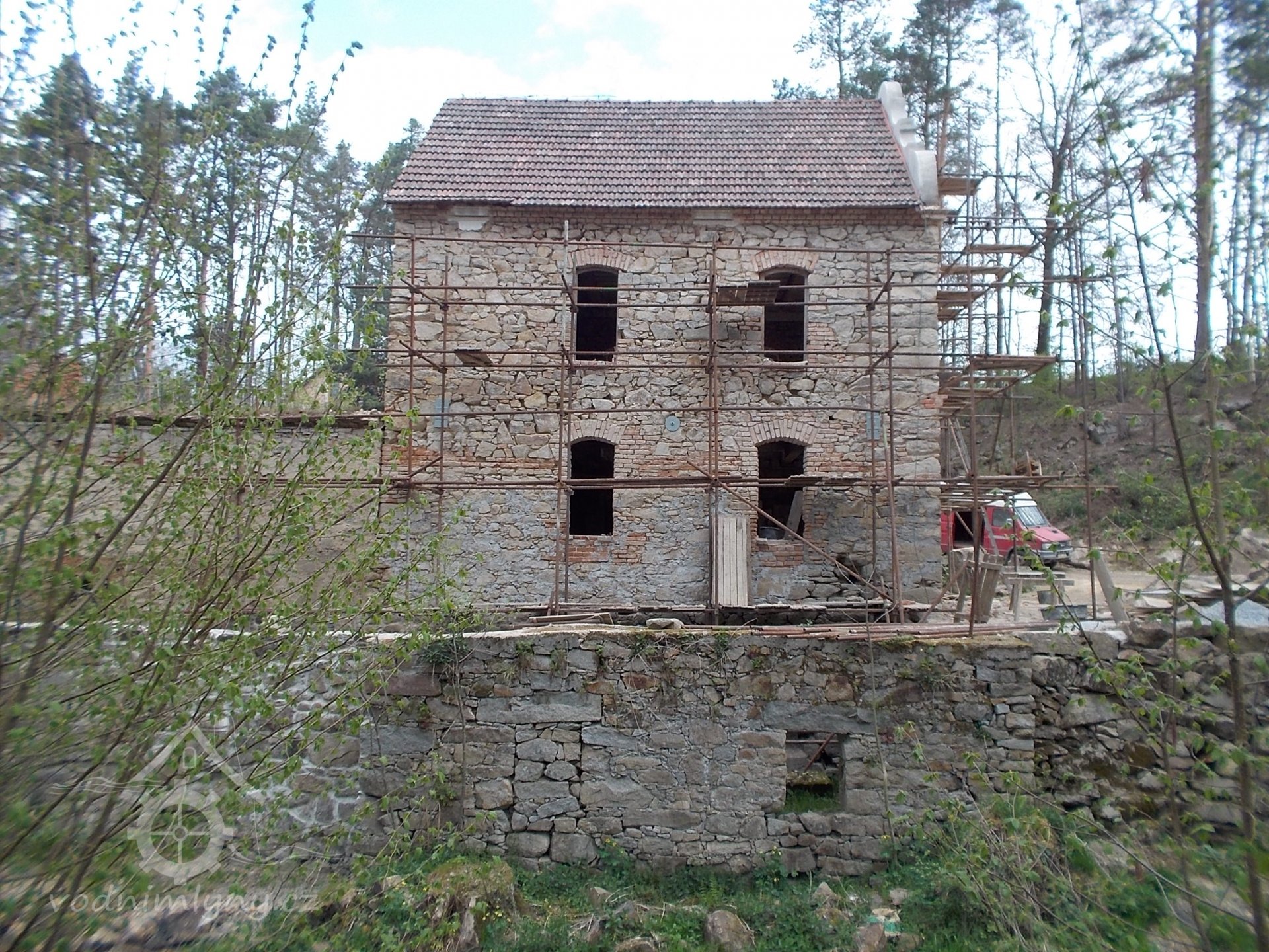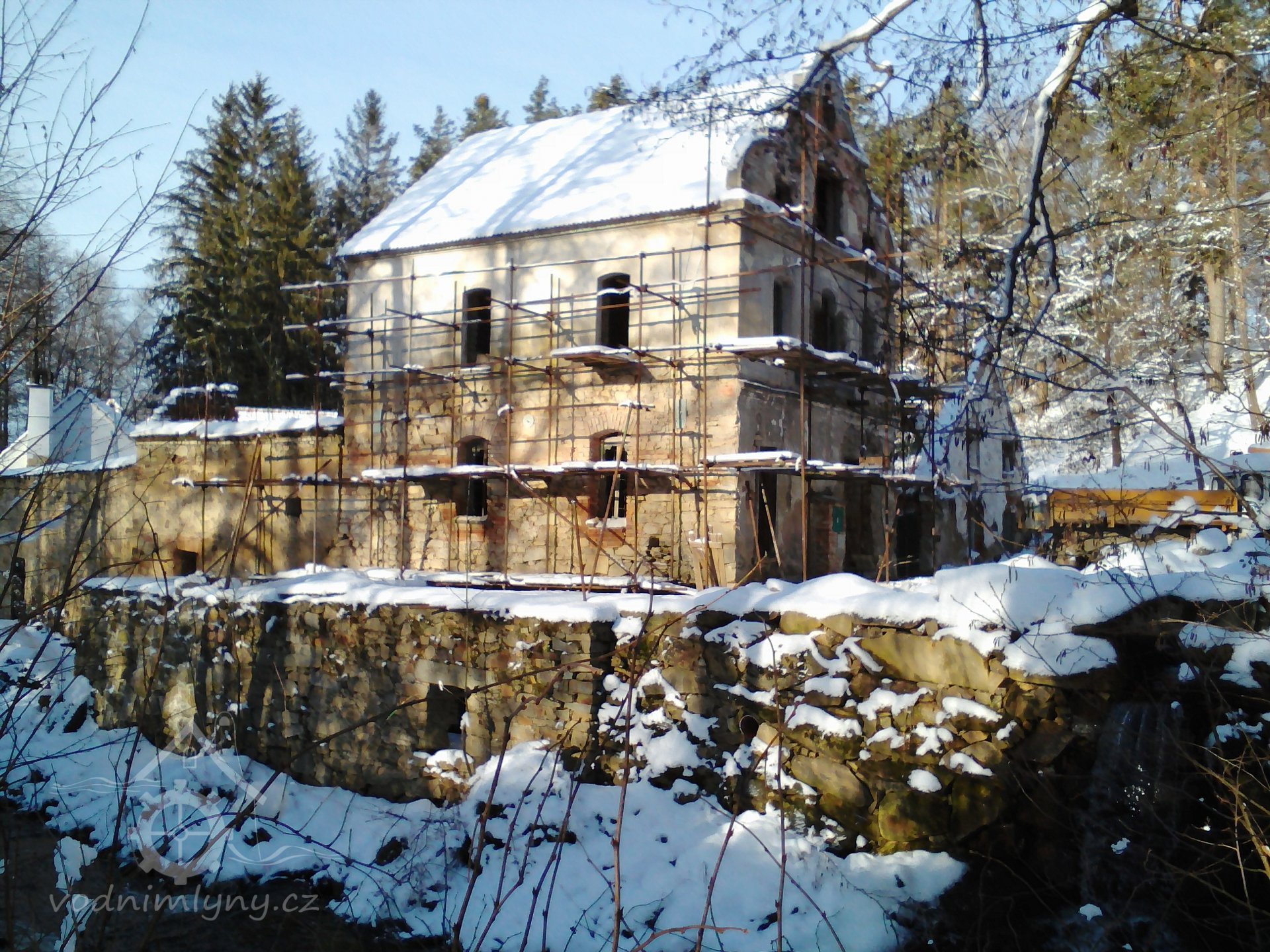 čelní stěna mlýnice, ještě s lešením - pohled ze staré zaniklé cesty ke Kudrlovu hamru pod Rejty, 12/2019, © PK