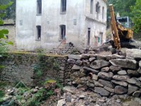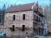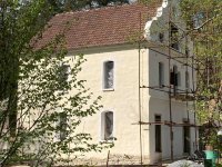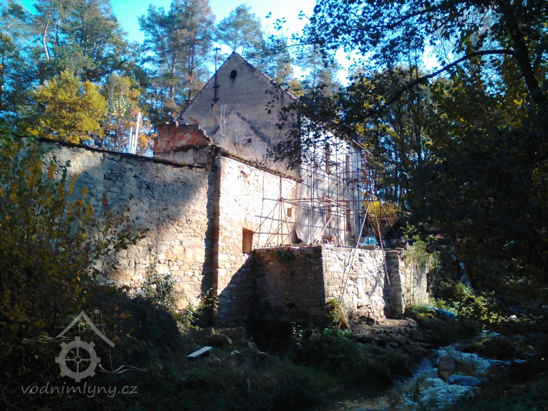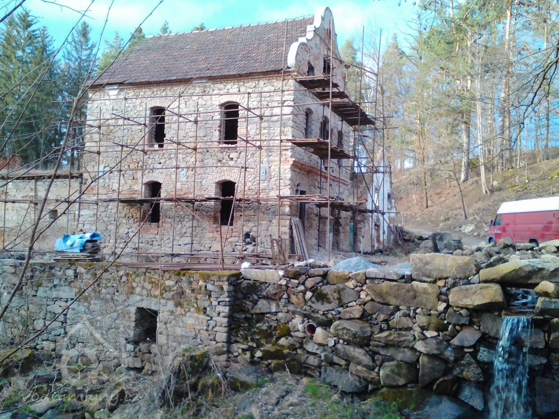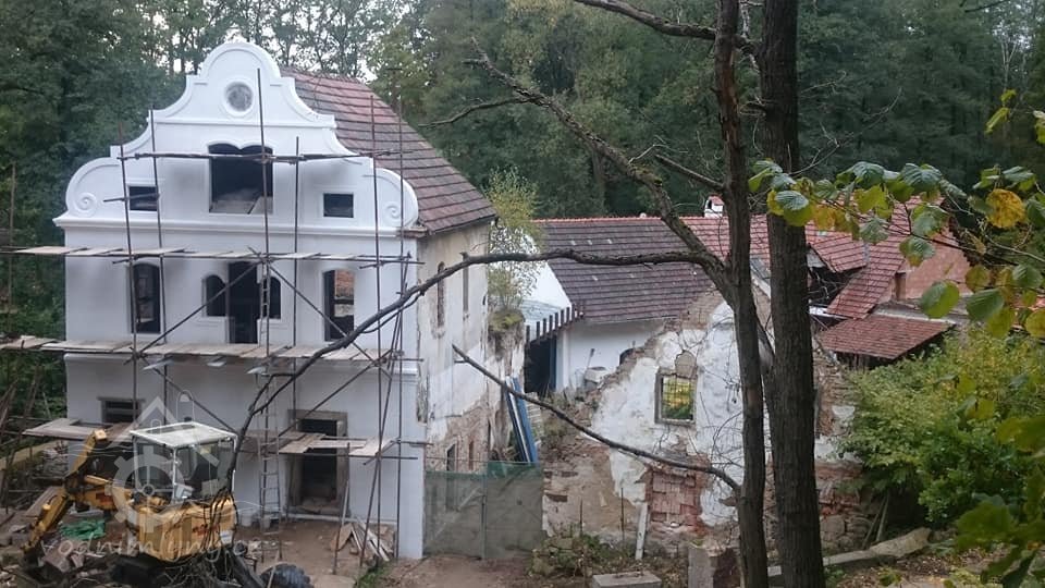 stavební ruch kolem - před časem se zbortila boční stěna lednice, prý se měla bourat kvůli spodní vodě a vlhkému zdivu pod mlýnicí, ale nyní již opět vypadlý materiál zpět na místě a očividně se konečně začíná pracovat přímo na mlýnici ? (viz. lešení), 10/2018, © PK