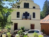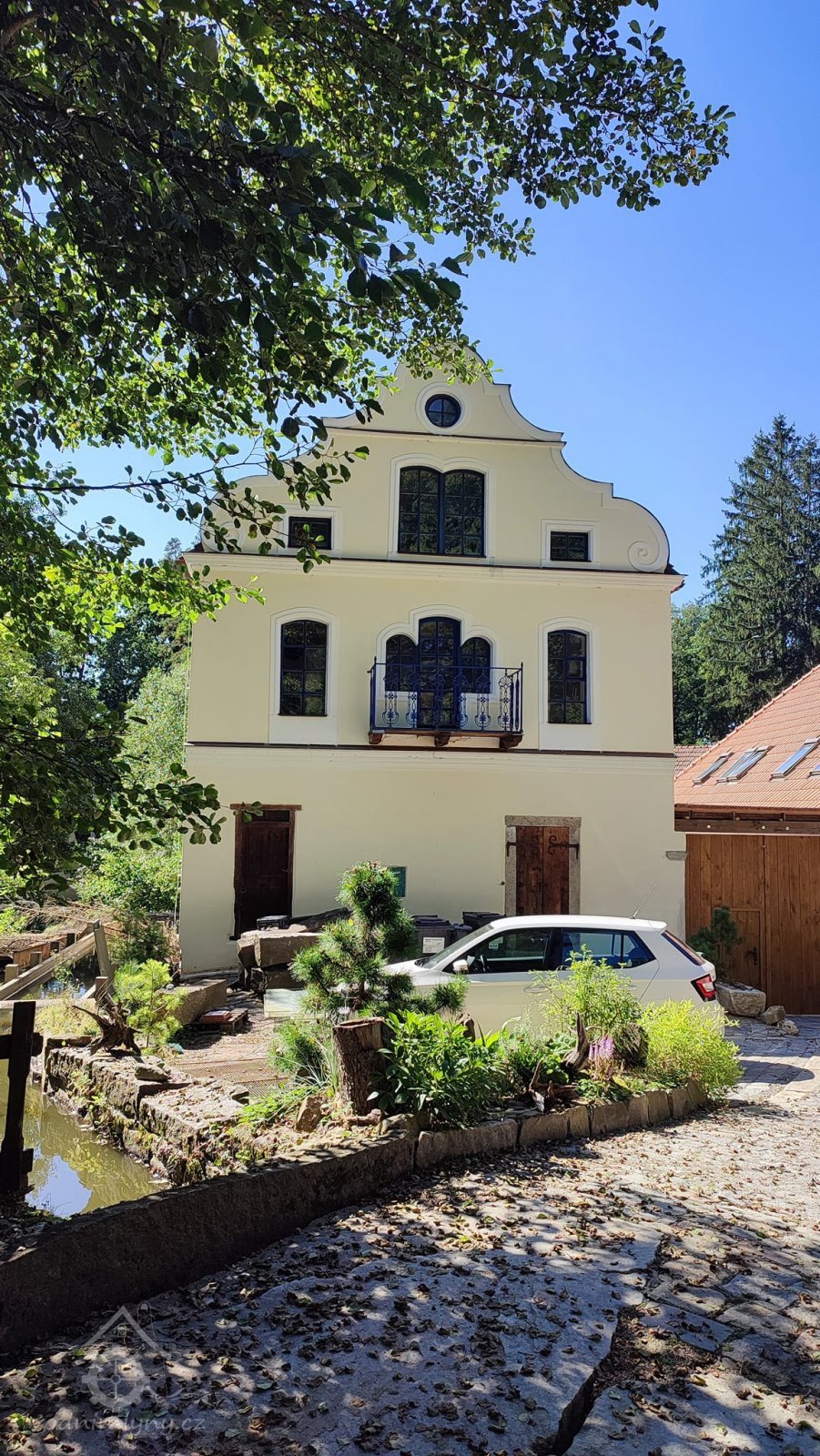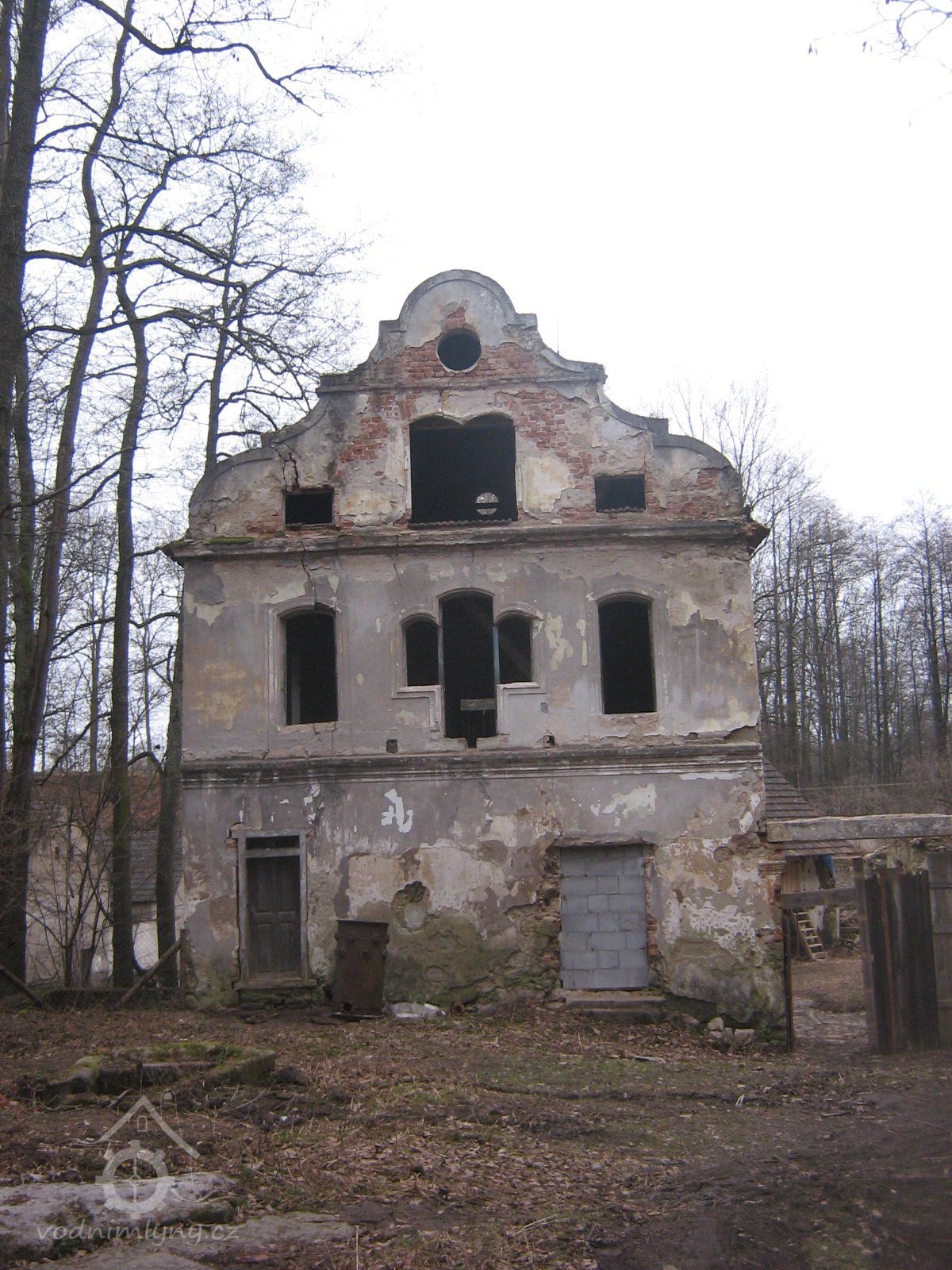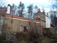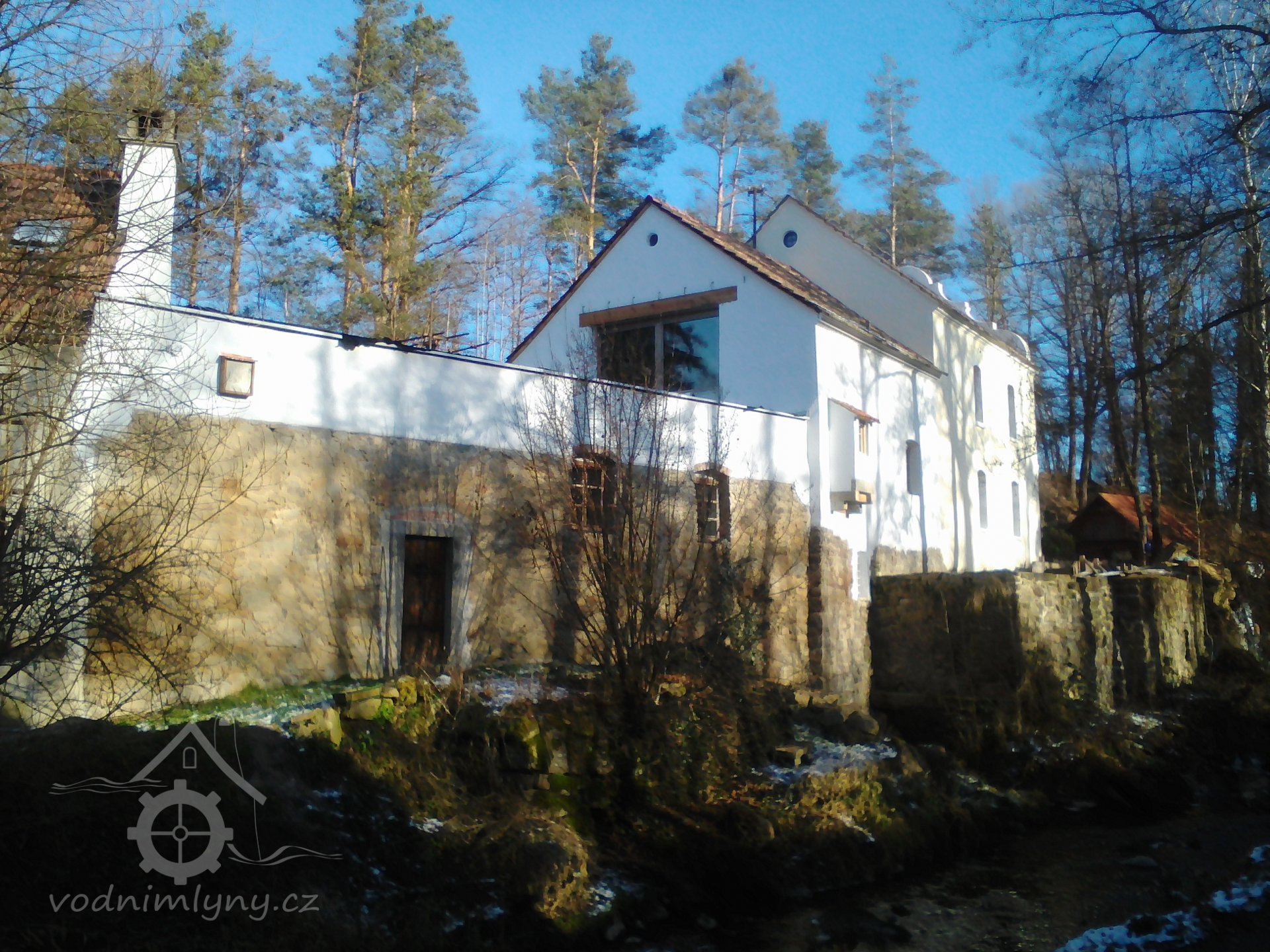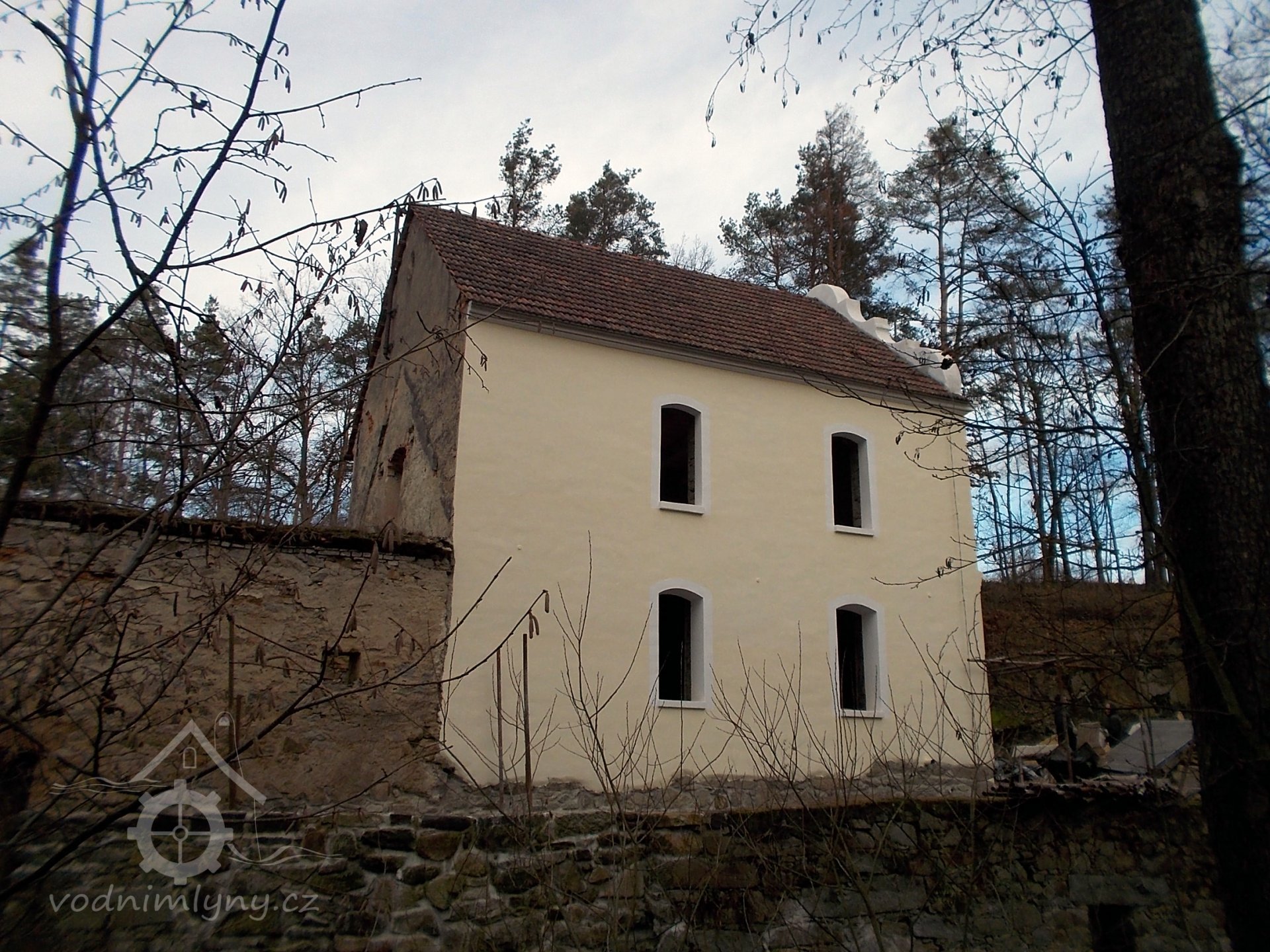 Aktuální boční pohled - druhé patro za mlýnicí je o trochu vyšší než bylo původně, zřejmě díky podkrovní vestavbě ? (ono panelové okno naštěstí není na pohledové straně objektu, mohlo to dopadnout jistě hůře) - viz. starší fotky na kartě, kde je vidět původní obrys štítu. Bohužel tedy zatím neexistují detailní fotky mlýna, než ze strany hlavního štítu od retenčního rybníka, ale i tak z toho mála jde usoudit, že ta 2 nová okna vedle prevétu/výsernice (k tomu více viz. detaily) jsou zde také navíc oproti původnímu stavu., 12/2020, © PK