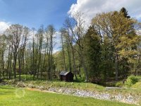 větší detail předchozího, dodejme, že v lednici se již točí replika vodního kola, ovšem pro vegetační situaci směrem od silnice nefotitelné..., via FB edit PK, 6/2020, © Růžena Jakubíková, (Prvky na obrázku: náhon, jalový žlab)