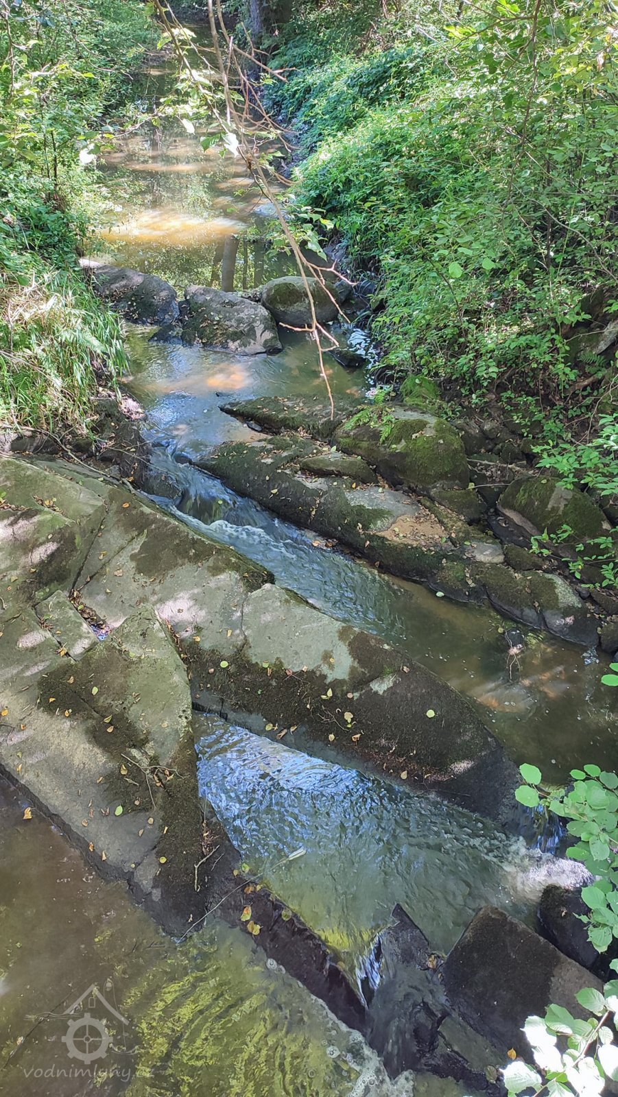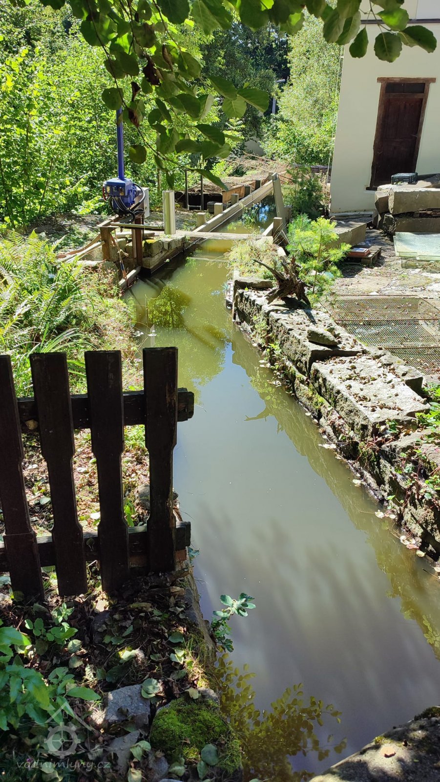 obnovený náhon s kamennou lávkou, jalovým žlabem se šoupětem a dřevěnými vantroky, via FB edit PK, 6/2020, © Růžena Jakubíková, (Prvky na obrázku: náhon, jalový žlab)