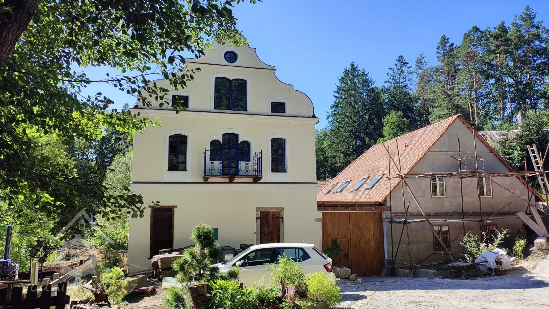 celkový pohled na rekonstruovaný areál mlýna ze zaniklé staré cesty směrem k Hamerskému rybníku, čelní strana mlýnice zřejmě před dokončením, via FB edit PK, 6/2020, © Růžena Jakubíková