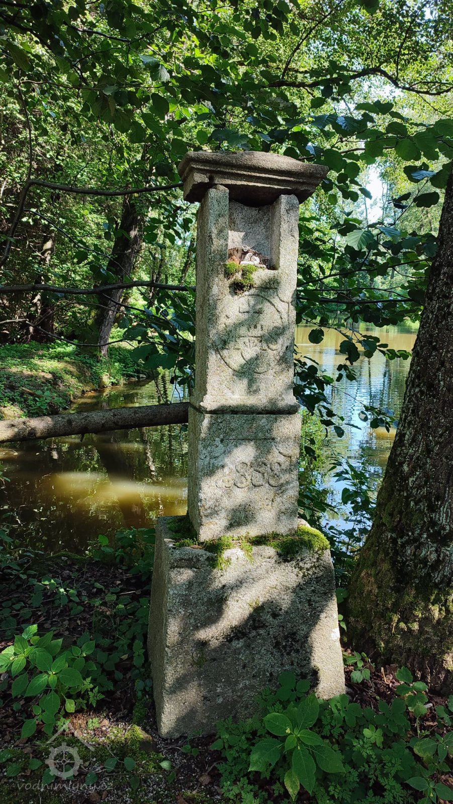 Podstavec kříže u mlýna, 08 2024, © Lenka Martínková, (Prvky na obrázku: drobné sakrální památky, kamenické prvky barokní a mladší)