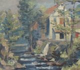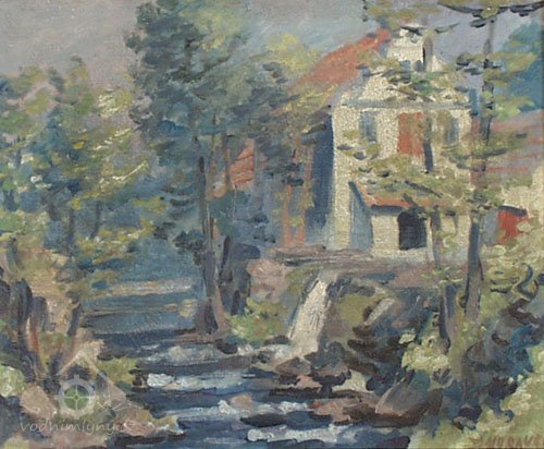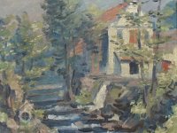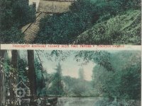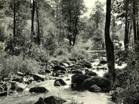 Tok Svinenského potoka s typickou siluetou mlýna v pozadí na dobové pohlednici, nedatováno, © -