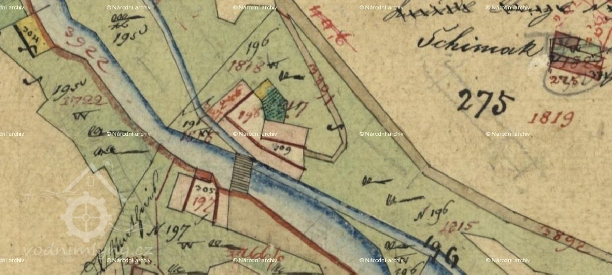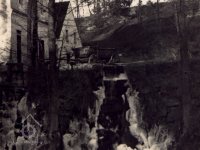 Hanzlův mlýn na sérii fotografií pravděpodobně při vysokém vodním stavu potoka. (zřejmě před rokem 45, bohužel malé rozlišení) Dům s křížem ve štítě je zřejmě protější čp. 197. zdroj: FB Město Trhové Sviny a okolí na pohlednicích, fotografiích a dokumentech, nedatováno, © autor neznámý