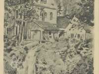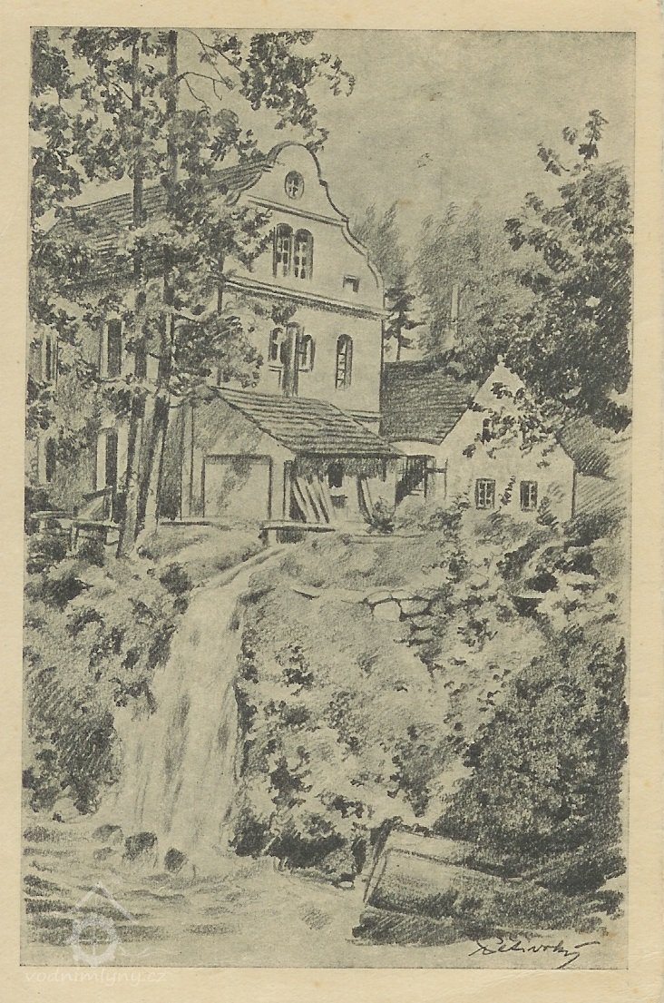 Hanzlův mlýn na dobové kreslené pohlednici z doby Protektorátu., 1939-1945, © Pětivoký