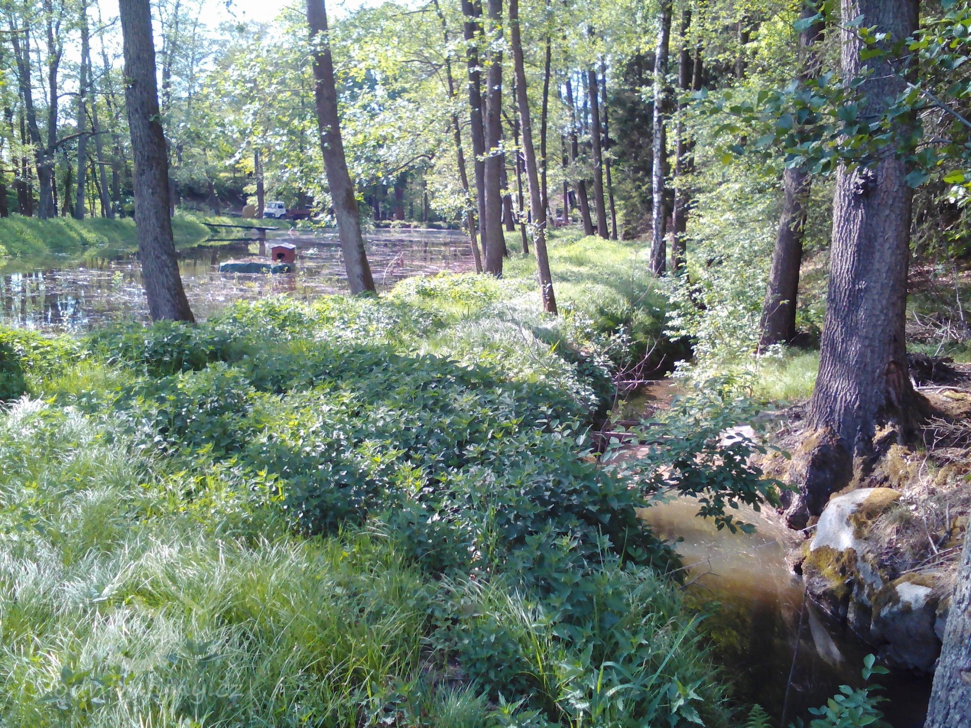 pohled na retenční rybník z hráze poldru - vlevo suchý kanál přepadu poldru, vpravo původní náhon, zpočátku zatrubněný pod hrází poldru, via FB (edit PK), 5/2020, © Růžena Jakubíková, (Prvky na obrázku: náhon, rybník)