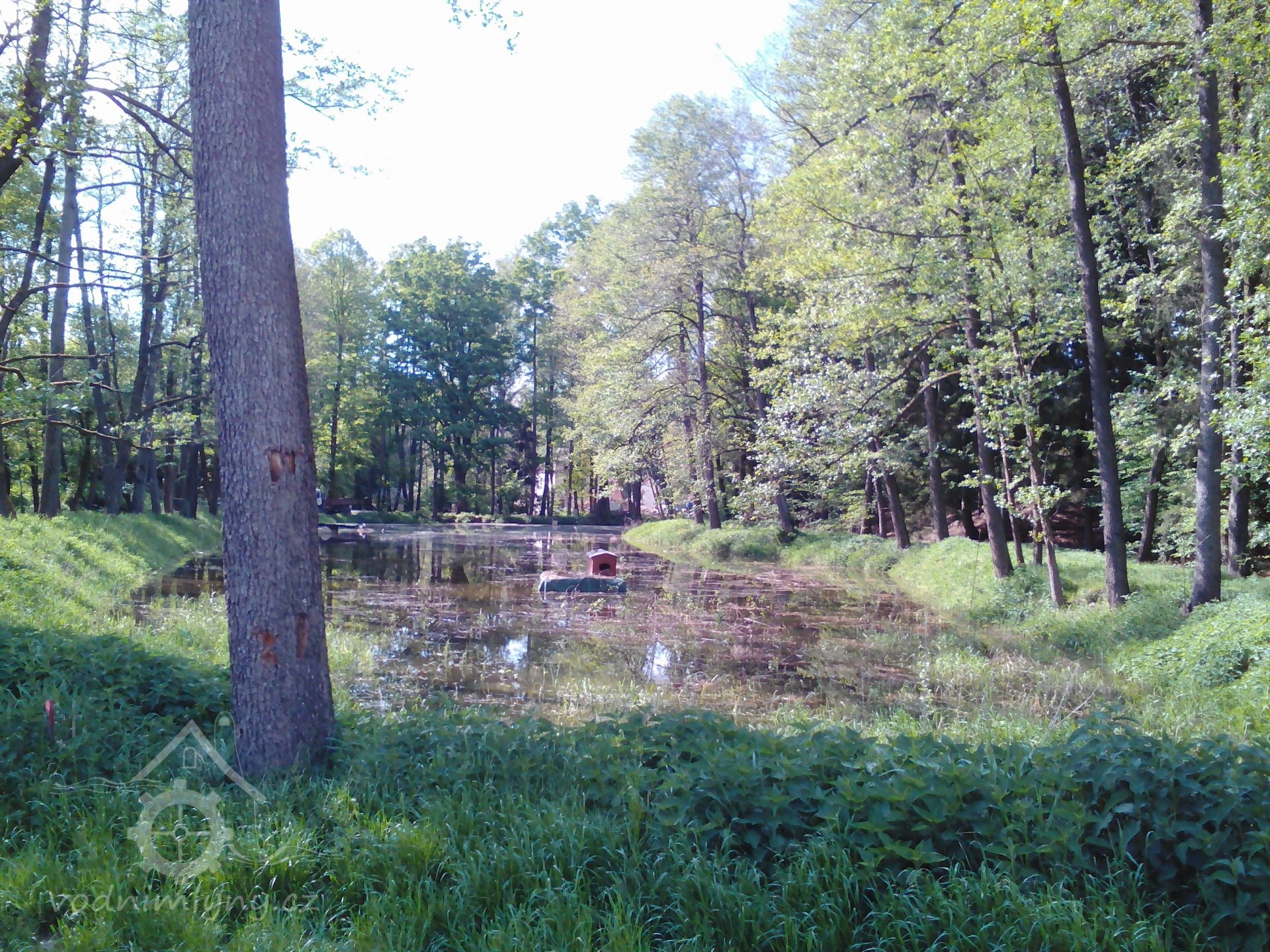 pohled přes znovu naplněný retenční rybník (čištění 2/2015, výztuž hráze 6/2015-3/2016, změny na začátku náhonu 12/2016 se stavbou poldru, nová brána 6/2017 a most na hráz rybníka 5/2018 - VŠECHNY ZMĚNY ZADOKUMENTOVÁNY) - mlýn prosvítá v pozadí, 5/2018, © PK, (Prvky na obrázku: rybník)