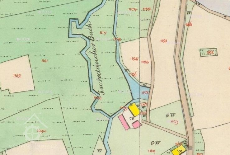 Dříve to byl mlýn, zvaný Horní, o němž je první zmínka z roku 1654. V Josefinském katastru je uvedeno, že „mlýn je to od nepaměti“. Vedl k němu náhon z potoku Řivnáč, zbudovaný od silničního mostu na začátku Svratouchu. Součástí byla i pila na řezání klád. Vodní pila měla výkon 2 HP, mlýn byl poháněn jedním kolem. Roku 1872 je uvedeno: vodní kolo má průměr 4.1 m, šířku 0.53 m a 1 obyčejné složení. V roce 1905 mlýn zanikl.