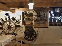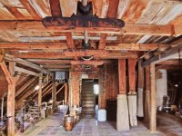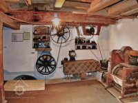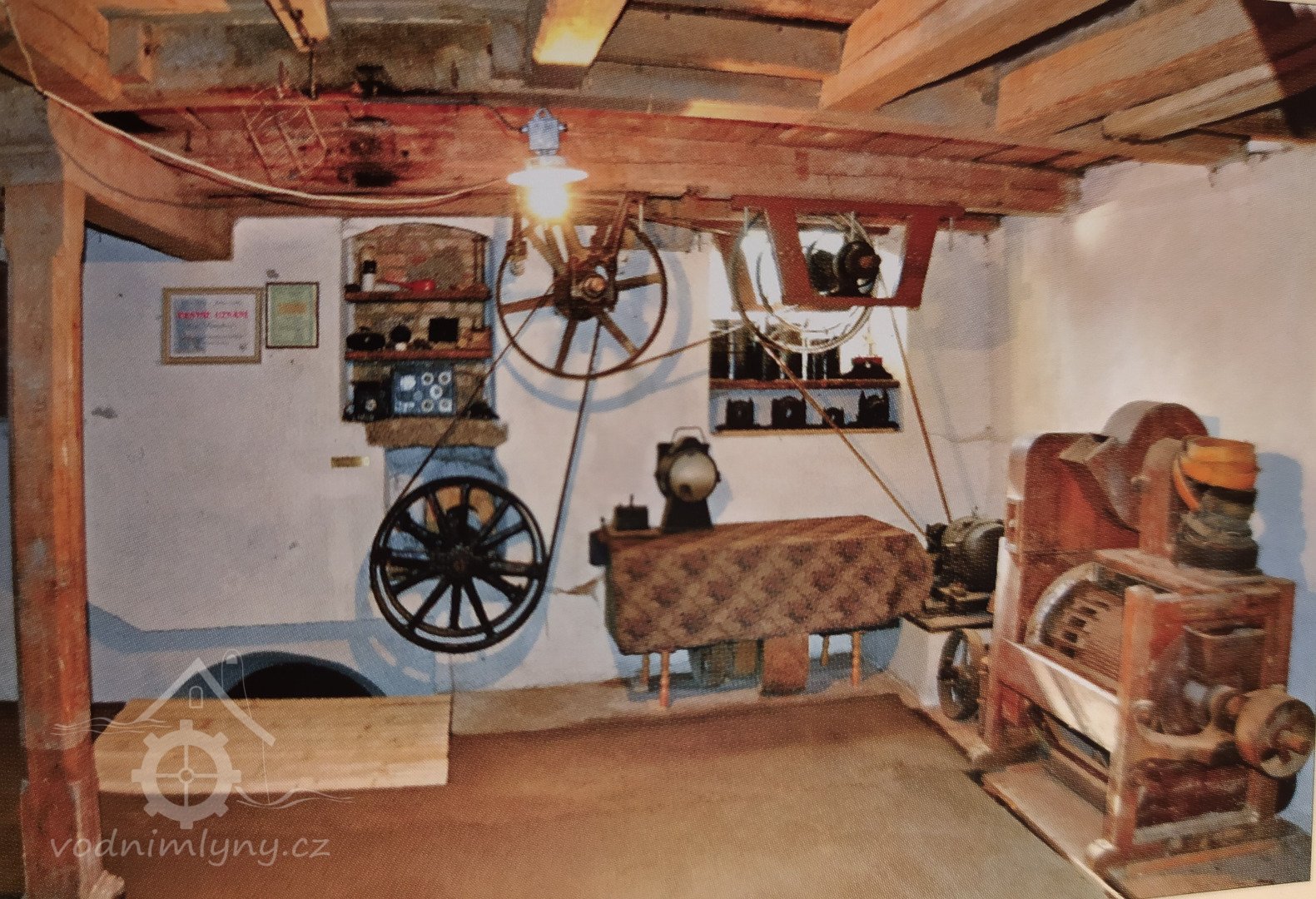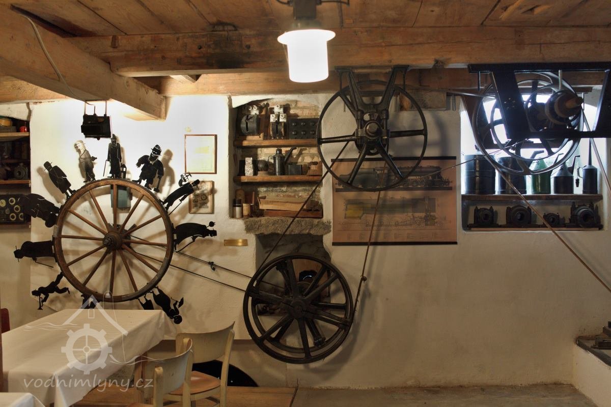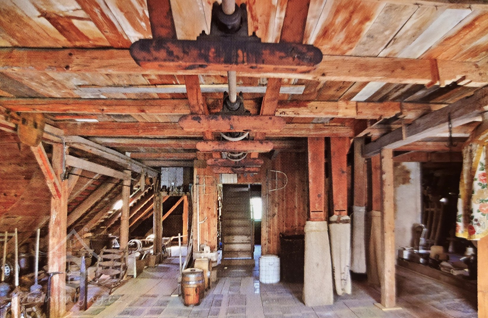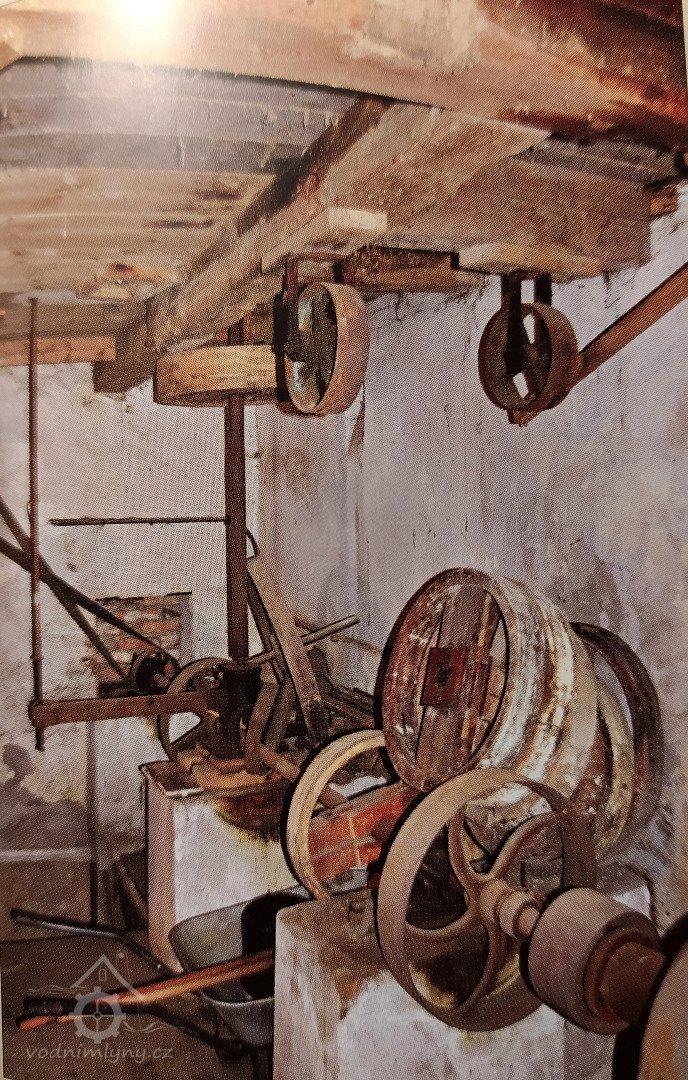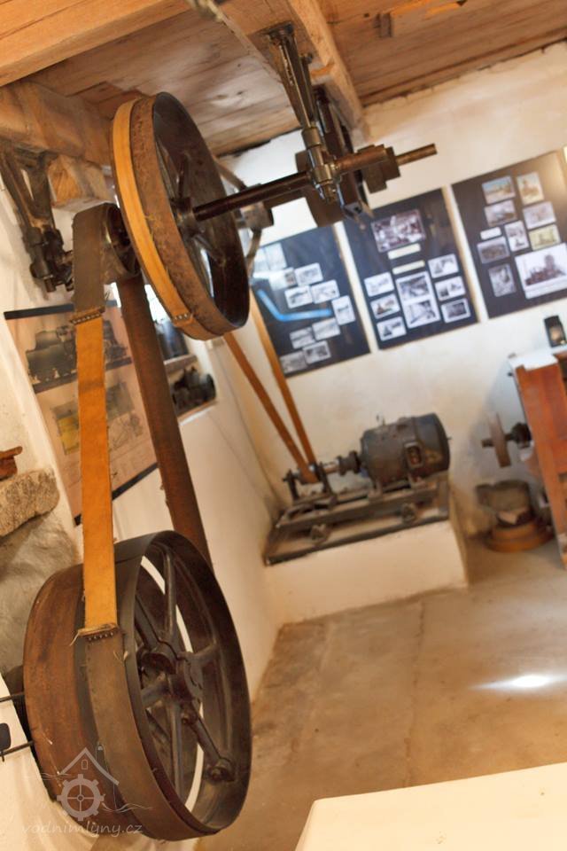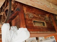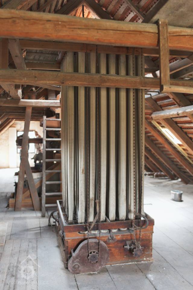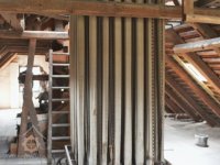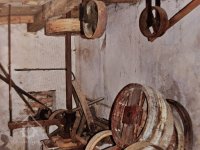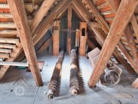 Podkroví s transmisí a spádovými trubkami, 10 2013, © M. Ouhrabka, (Prvky na obrázku: transmise, řemenice, převody - transmisní hřídele s řemenicemi (výrobek průmyslový i řemeslný))
