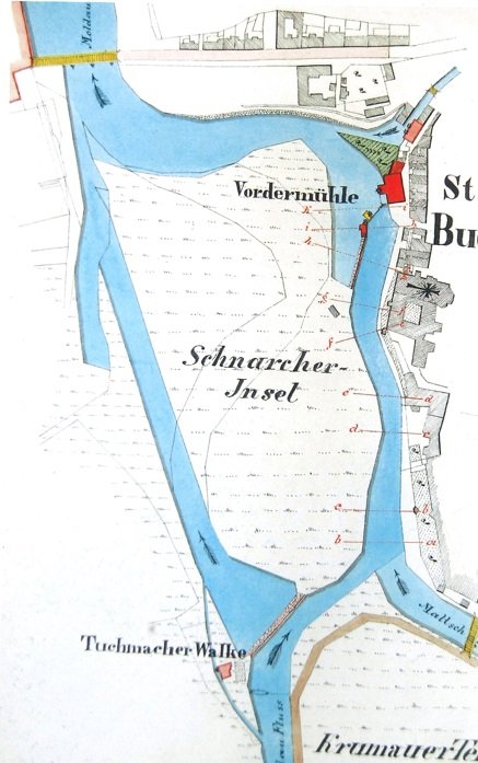 Poznámka k sekci: Přední mlýn a ztráta jeho "vodní síly" jsou zmíněny v souvislosti s plánem přestavby této části města z let 1914-1915. Při této akci mělo být mezi Železnou pannou a Předním mlýnem zavezeno "slepé rameno" Malše (= také náhon). Vznikla by tak možná nová ulice a na Střeleckém ostrově nový blok domů - zřejmě by v tomto případě nutně musela vzniknout nová komunikace se středem města proražením hradeb (v lepším případě mělo jít o park, navazující na plochu ostrova). Připomínkou těchto plánů z poč. 20. st. je dodnes budova gymnázia v České ulici, které je honosným západním průčelím obráceno "opačně", tj. se do budovy dnes vstupuje z ulice původně plánovaným zadním vchodem (projektant tedy již počítal, že řeka zde v budoucnu zmizí). Samozřejmě proti tomu všemu vznikly protesty, které poukazovaly jednak na ztrátu estetických kvalit této části města a nebo na otázky statiky historických objektů dominikánského kláštera a hradeb. Město naopak argumentovalo otázkami hygieny, tj. že by ve "slepém rameni" zahnívala voda. Nakonec zvítězil logický kompromis : staré koryto u hradeb bylo zachováno jako pomalu tekoucí s odtokem regulovaným úzkou propustí v hrázi mezi Předním a Malým mlýnem.