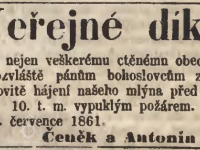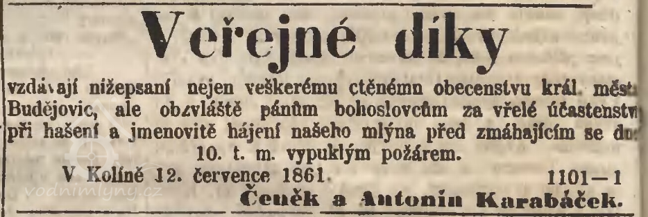 10. července 1861 požár mlýna, majitelé Čeněk a Antonín Karabáčkovi (+ Anna a Františka K.) (RR, edit PK, zdroj https://www.budejckadrbna.cz/zpravy/spolecnost/20551-drbna-historicka-s-opravou-predniho-mlyna-to-bylo-slozite-dnes-je-z-nej-hotel.htm)